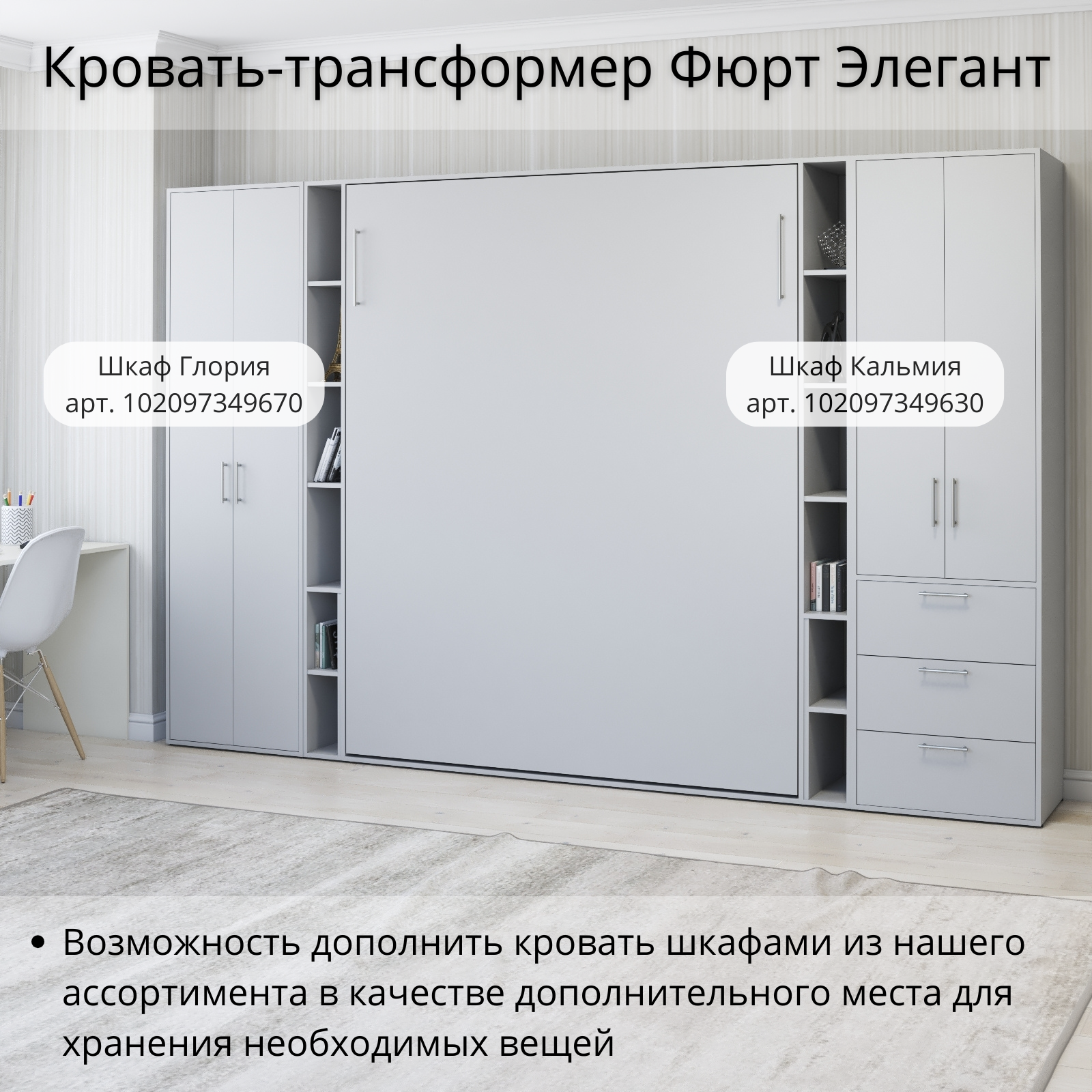 Шкаф кровать трансформер с креплением к стене, Stylint, Фюрт Элегант, 90х200, Серый шагрень/Белый платиновый