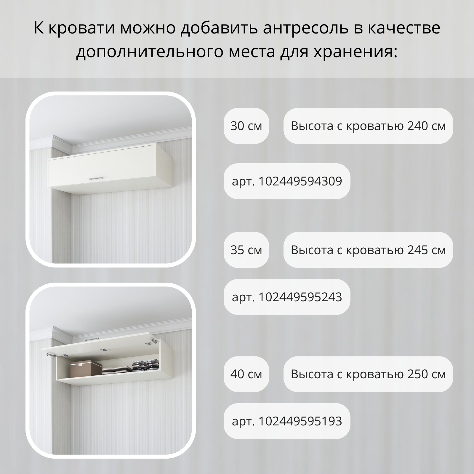 | Дополнительная информация | Внимание! Мебель в данном заказе должна быть прикреплена к капитальной бетонной стене, толщиной не менее 12 см, и не имеющей дополнительных слоёв, таких как утеплитель, звукоизоляция, толстая штукатурка и т.д. Крепление Мебели к стене, не отвечающей этим требованиям, запрещено. Сборка и крепление Мебели к стене должны осуществляться квалифицированным специалистом. Выбор стены, соответствующей этим требованиям, возлагается на клиента. Перед использованием кровати необходимо ознакомиться с техническим паспортом |