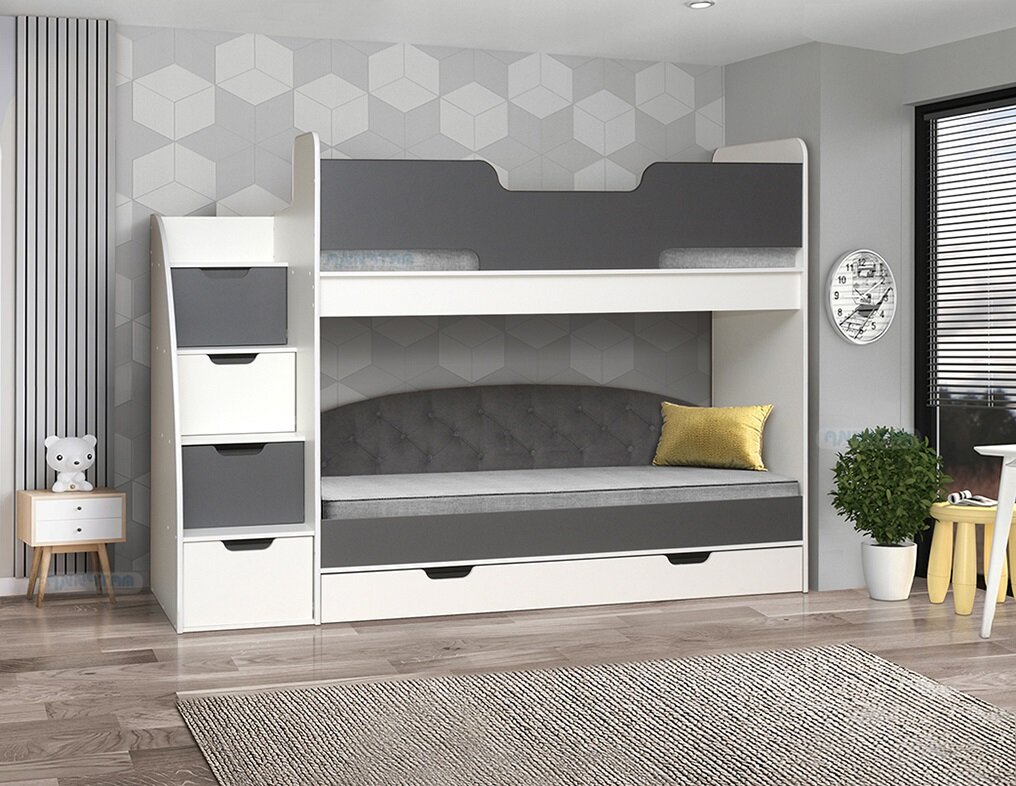 Matrix кровать детская двухъярусная с мягкой спинкой "Junior 13" белый/графит, лестница справа