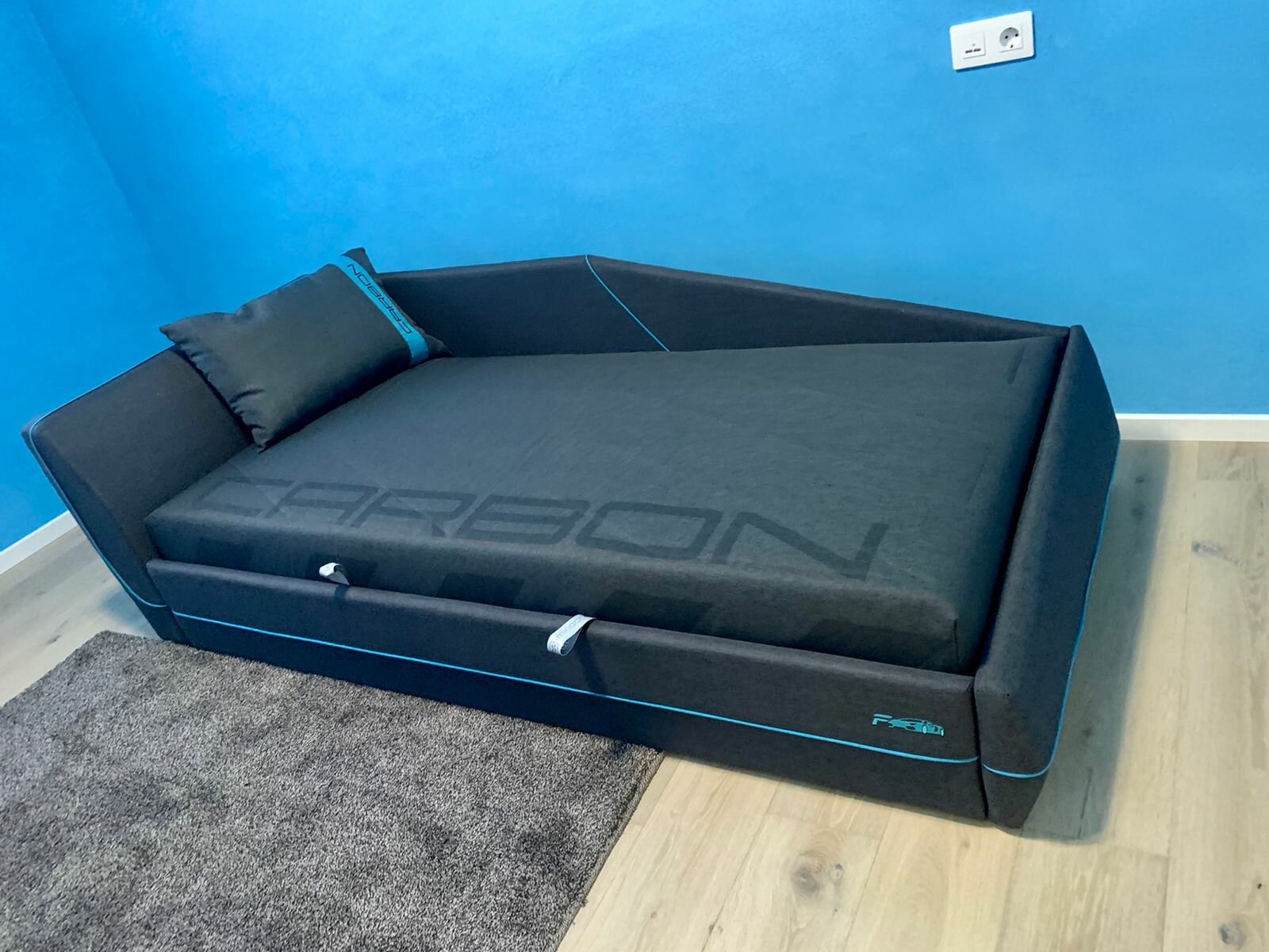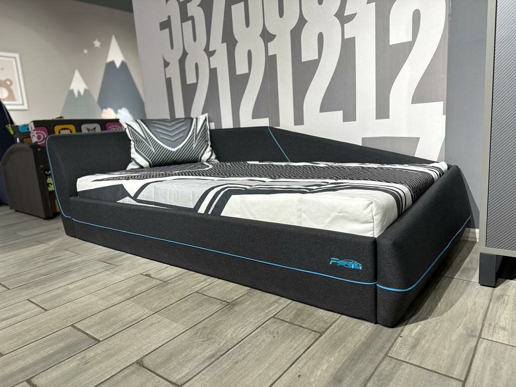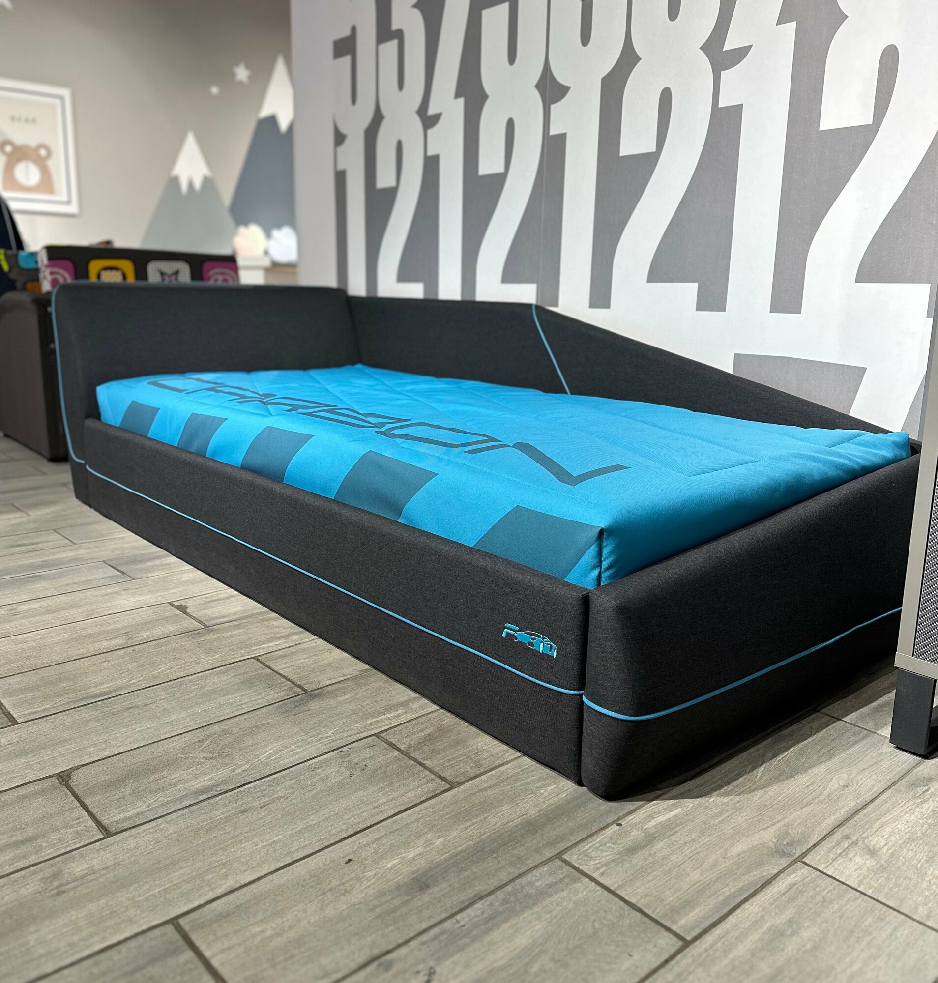 Фабрика Мирлачёва кровать для подростка CARBON-NEW, размер 90х190, реечное основание с подъемным механизмом, изголовье слева, кант голубой