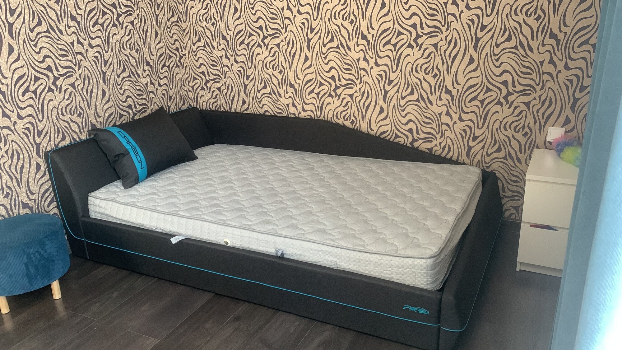 Фабрика Мирлачёва Кровать CARBON 90х190 со встроенным матрасным блоком, изголовье справа, кант бирюза