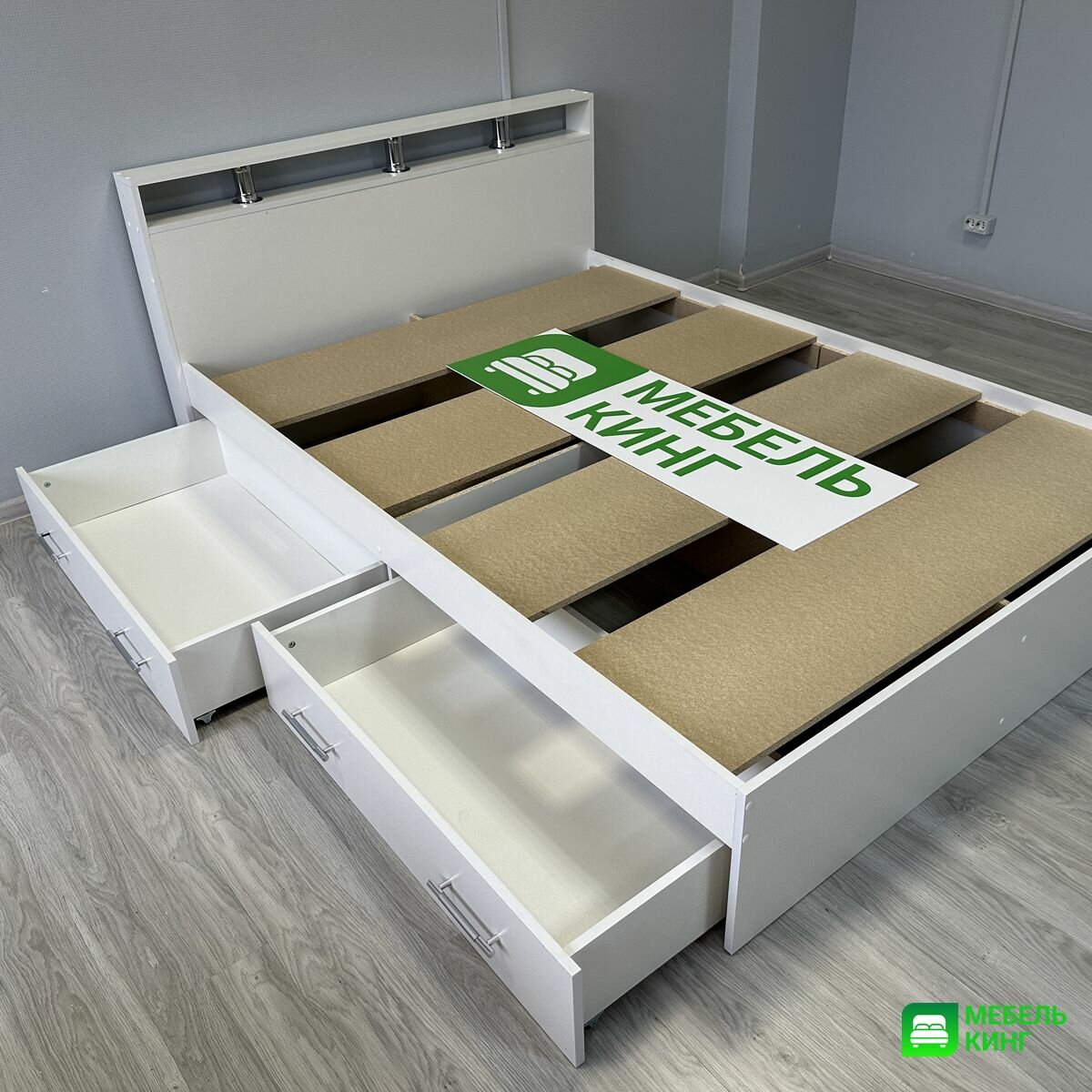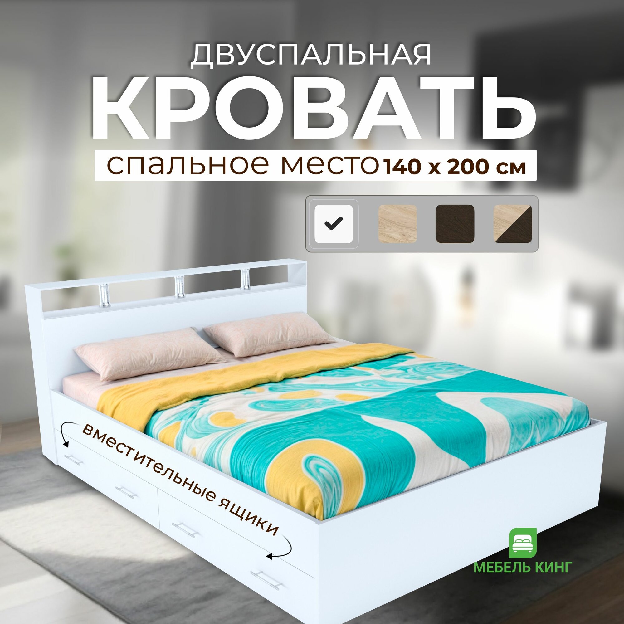 Двуспальная кровать с усиленным ДСП основанием Саломея с ящиками 140х200, белая, Мебель Кинг
