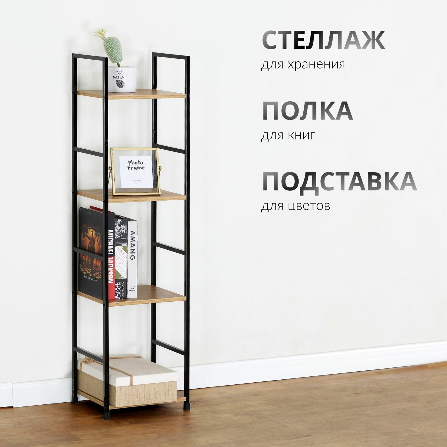 Стеллаж узкий Вудми, 4 полки, Черный дуб