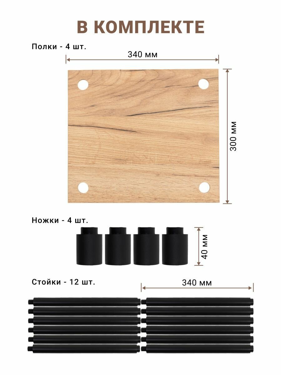 | Комплектация | полка ЛДСП с 4 футорками - 1 шт.; полка ЛДСП с 4 сквозными отверстиями - 3 шт.; стойка пластик - 12 шт.; ножка пластик - 4 шт.; Инструкция по сборке - 1 шт. |