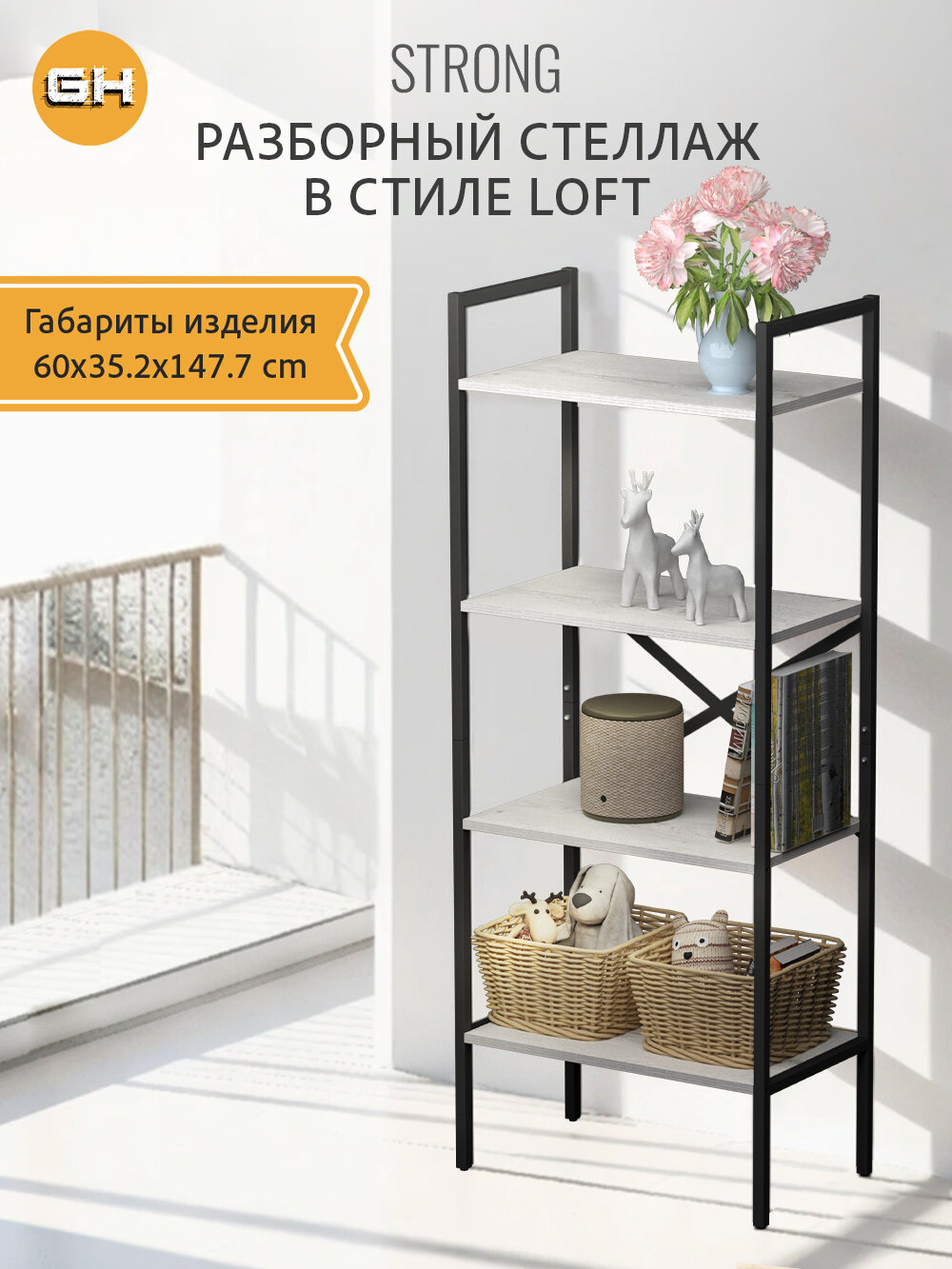 Стеллаж STRONG mini loft, белый, модульный, напольный с 4 полками, 147х40х35 см, гростат