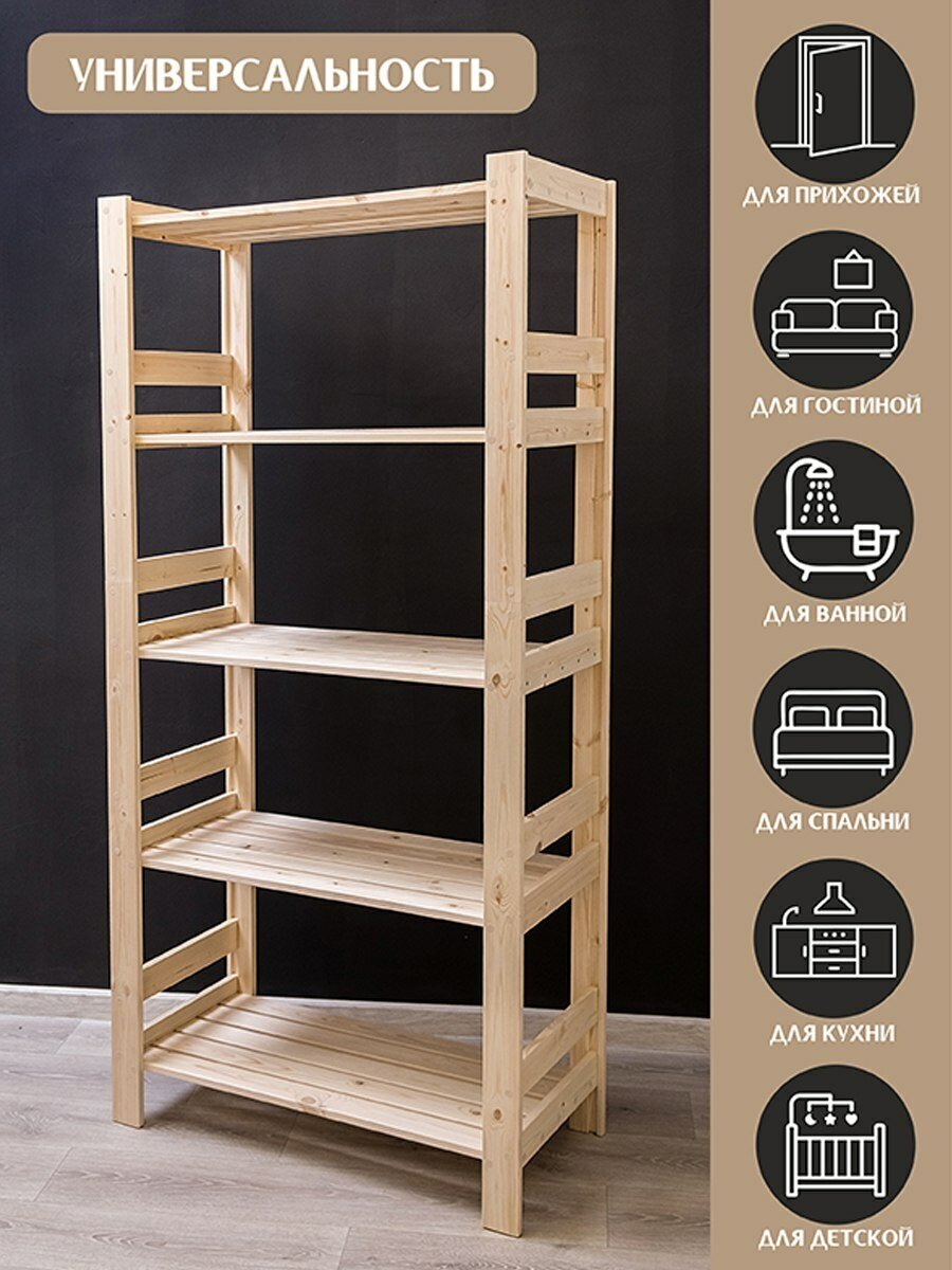 Стеллаж деревянный повышенной прочности мебельного качества для хранения в ванной на кухне для книг и игрушек 5 полок