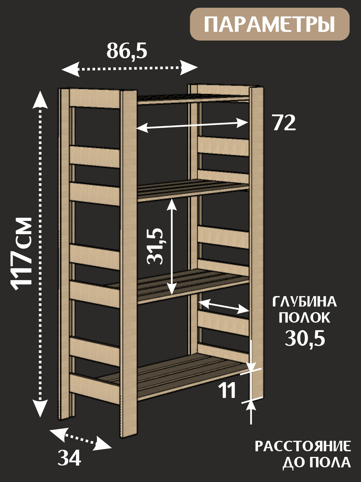 | Дополнительная информация | Собственное производство стеллажей позволяет добиться максимального качества. Используя высокоточные технологии обработки древесины, получаем идеально отшлифованные, гладкие детали из дерева. Надёжная конструкция на евровинтах прослужит много лет. Упаковка из прочного картона обеспечит доставку изделия в лучшем виде! |