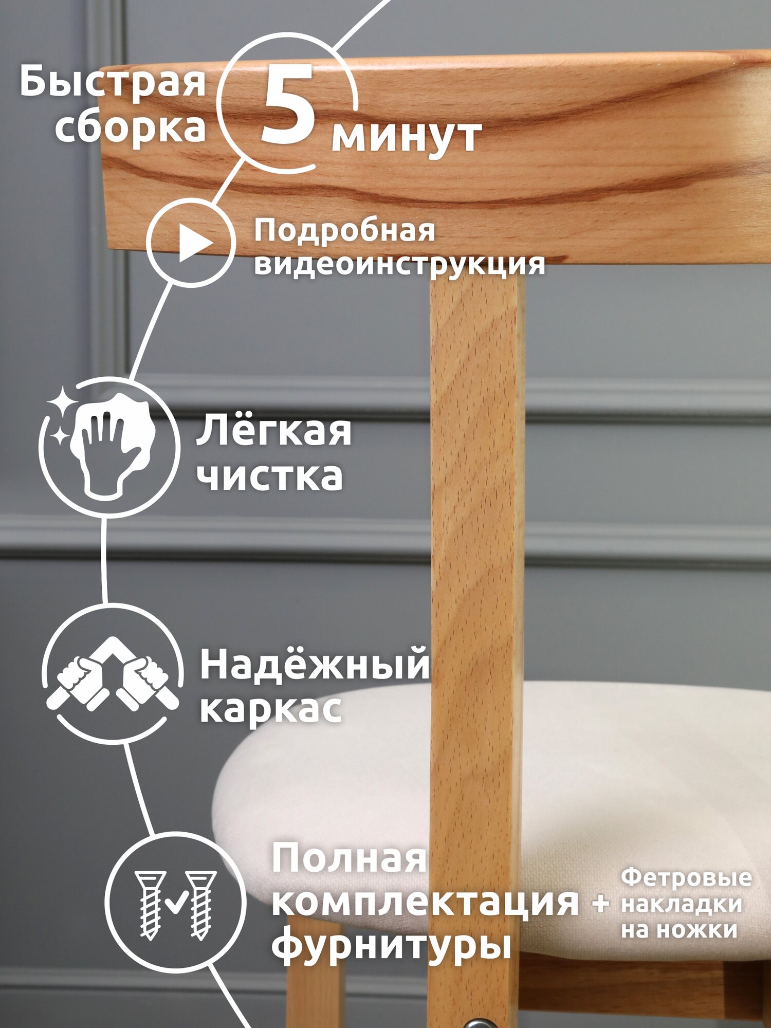 | Комплектация | Каркас - 1 шт.; задний пояс - 1 шт.; нога левая/правая - 2 шт.; сиденье - 1 шт.; винт мебельный м6х60 - 4 шт.; винт мебельный м6х70 - 4 шт. 7) Стяжка-бочонок под прямой шлиц - 4 шт. 8) Ключ шестигранный 4мм - 1 шт. 9) Фетровая подставка - 4 шт. |