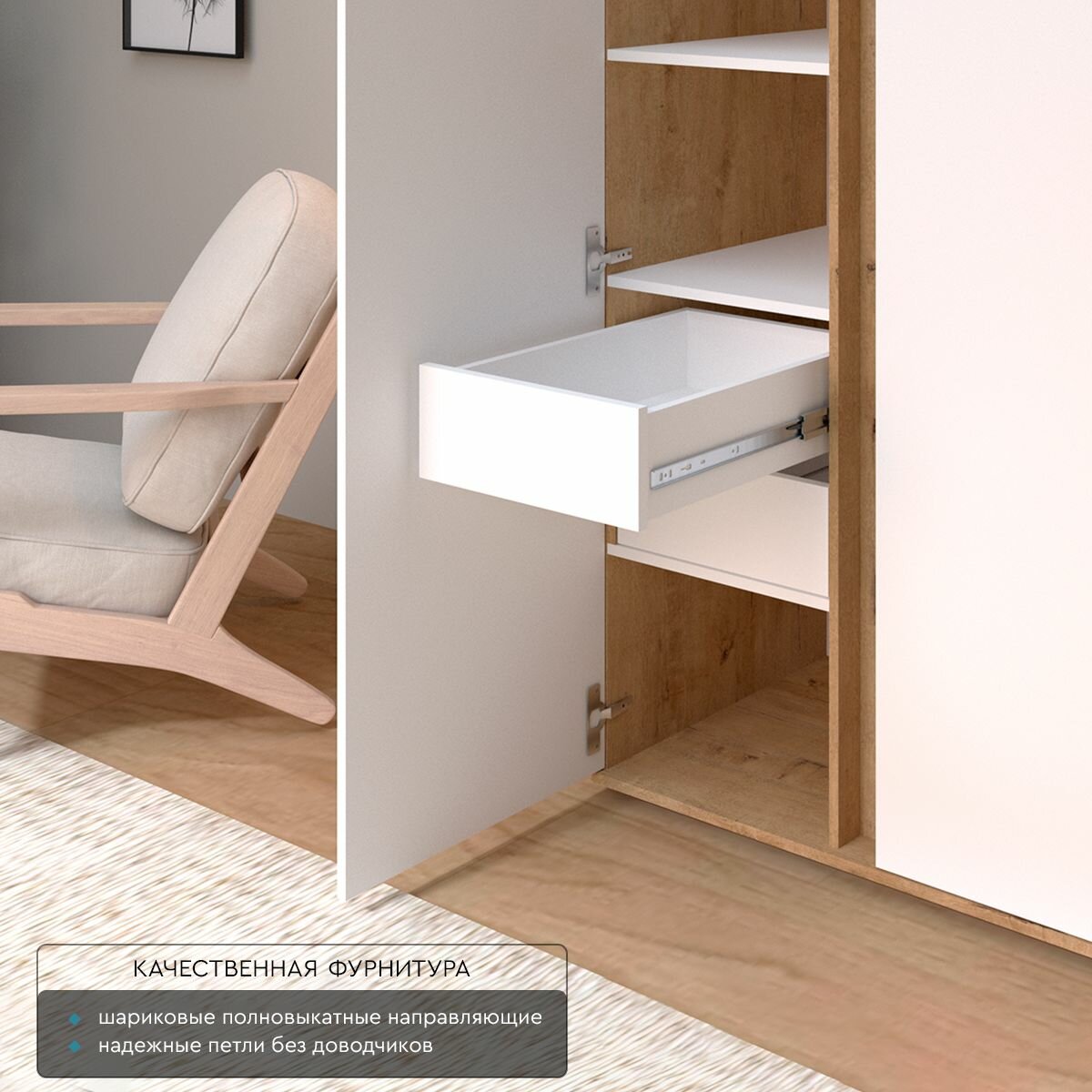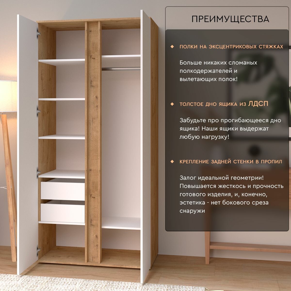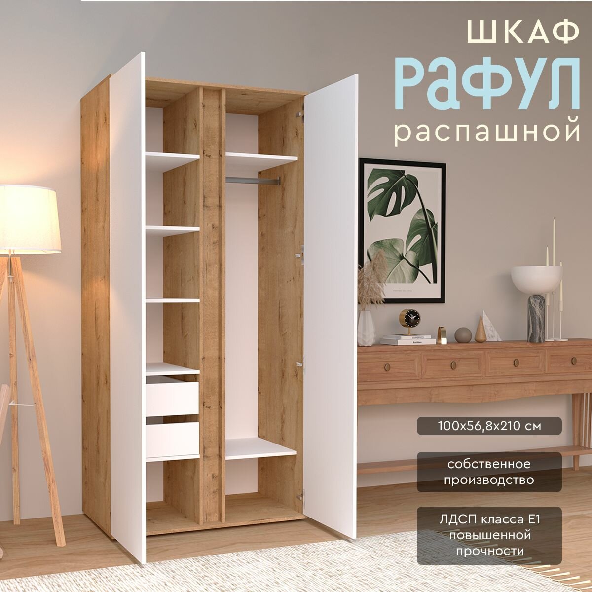 Шкаф распашной Рафул со штангой и полками Wood&Stone, дуб бунратти, белый интересное: