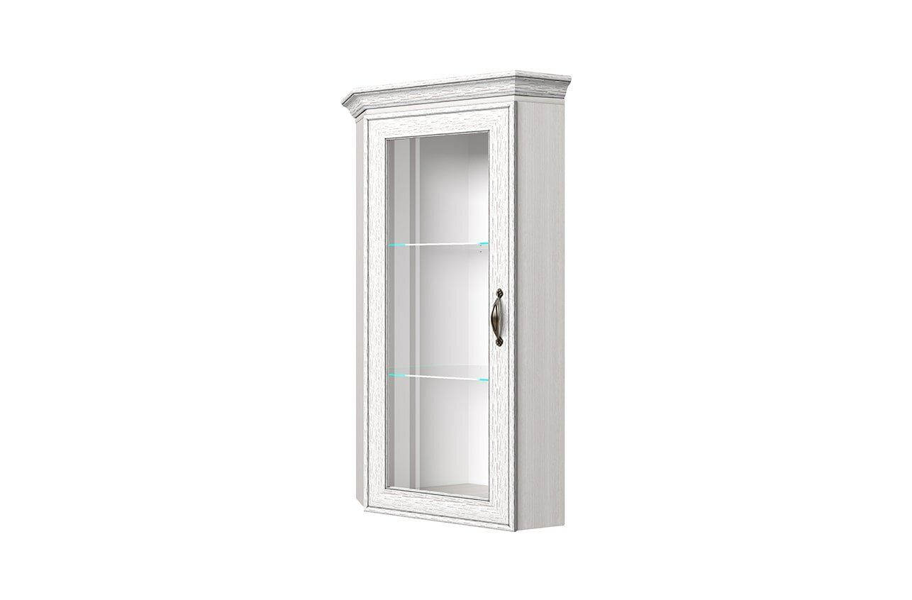 | Комплектация | Шкаф с витриной Монако 1VU – угловой (U). Имеет одно отделение с полками из закалённого стекла за витриной (1V) для хранения предметов декора, посуды, памятных предметов. |