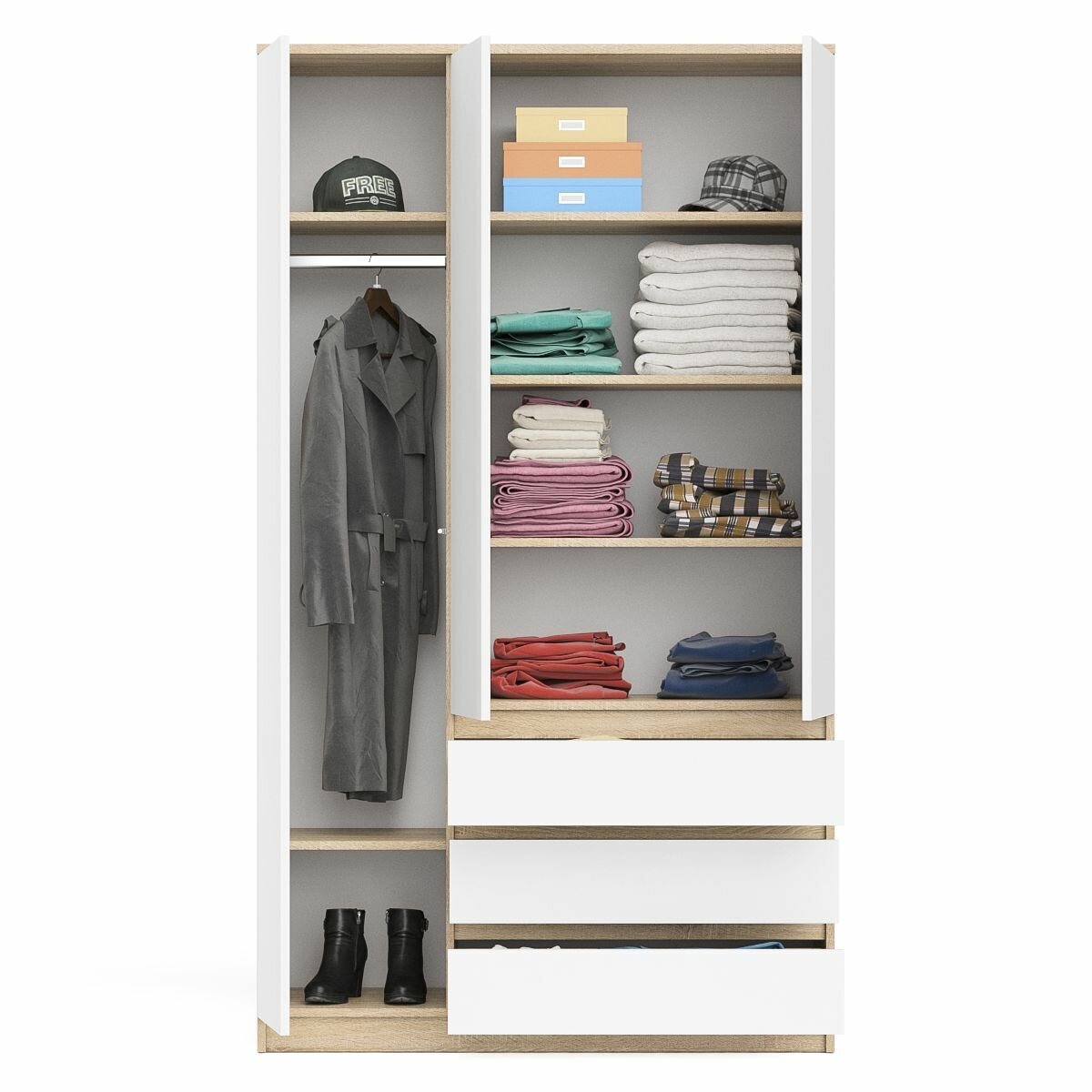 Шкаф для одежды распашной СВК Мори МШ1200.1, 3 двери, 3 ящика, цвет дуб сонома/белый
