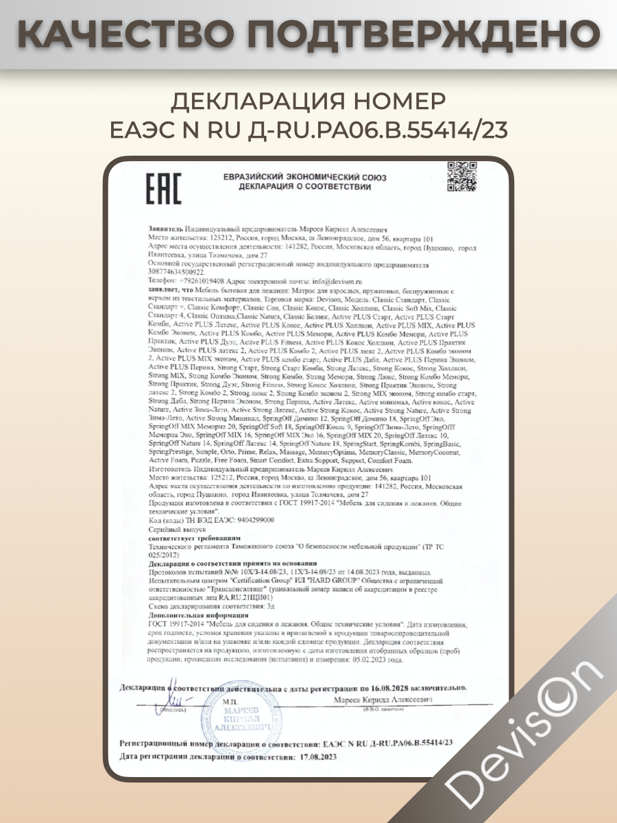 | Дополнительная информация | Двуспальный двусторонний матрас для спальни |