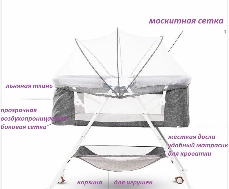 Кроватка-колыбель BAOBAO, приставная, серая, с москитной сеткой, с матрасом