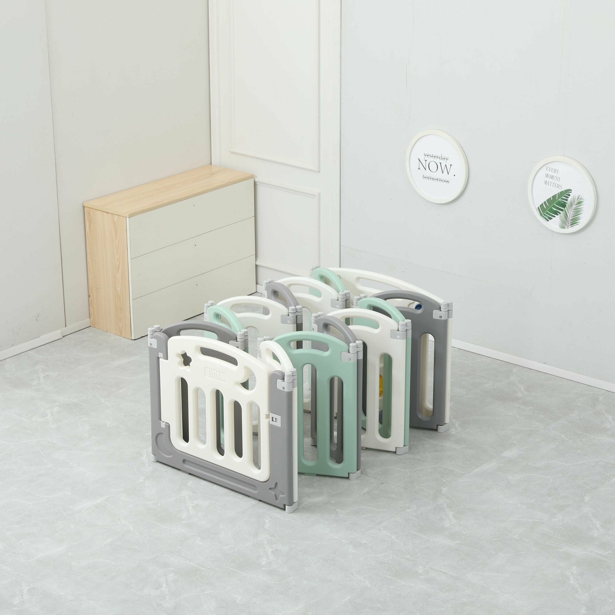 Манеж UNIX Kids Simple, для дома и улицы, бизиборд, от 0 месяцев, складной, белый/серый/зеленый, 151x151 см