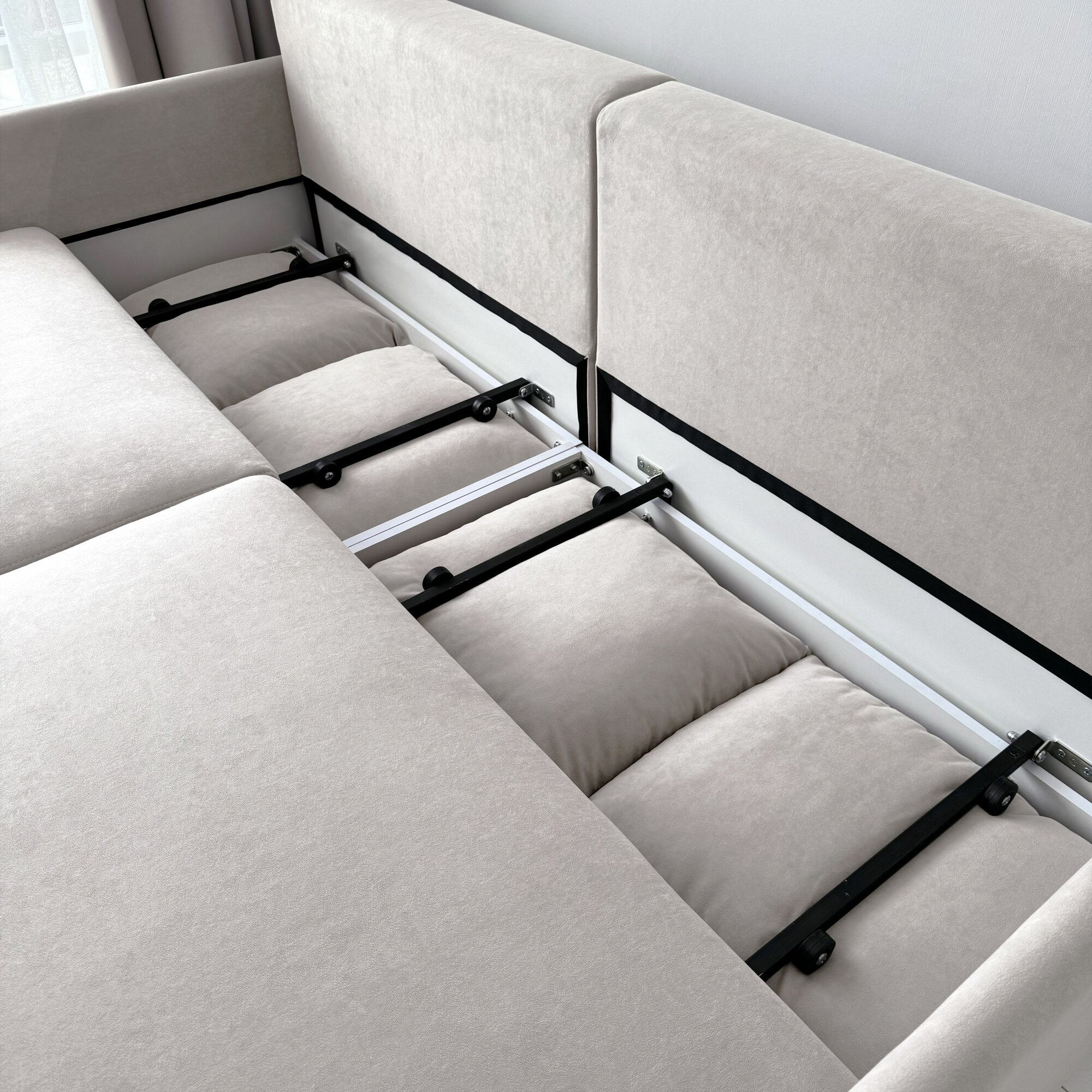 | Особенности | модульный, пружинный блок, раскладная конструкция, с подлокотниками, съемный чехол, ящик для белья |