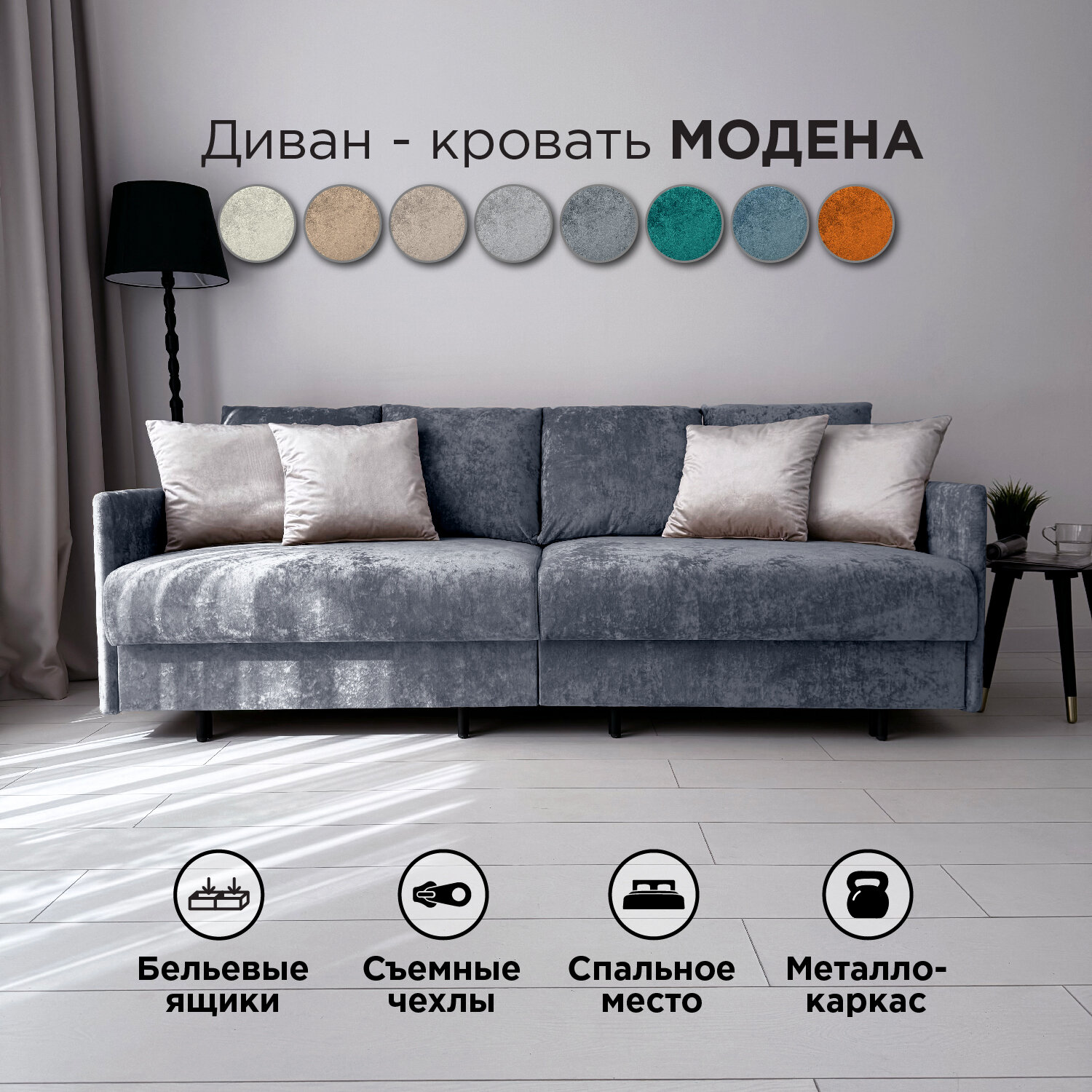 Диван-кровать Redsofa Модена 210см серебристый Ocean. Раскладной прямой диван со съемными чехлами Редсофа, для дома и офиса