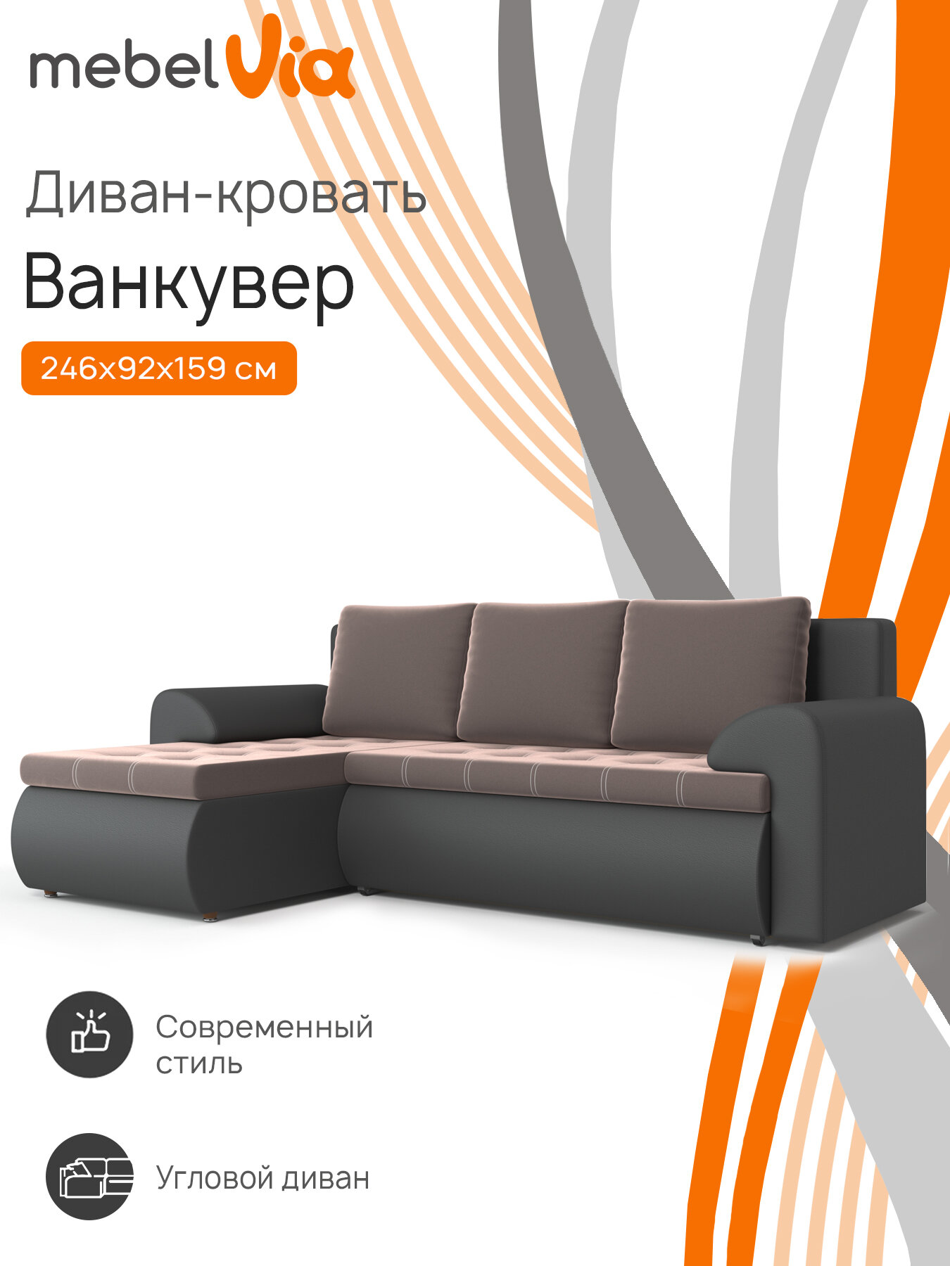 Угловой диван Ванкувер коричневый, черный Правое, искусственная кожа, велюр