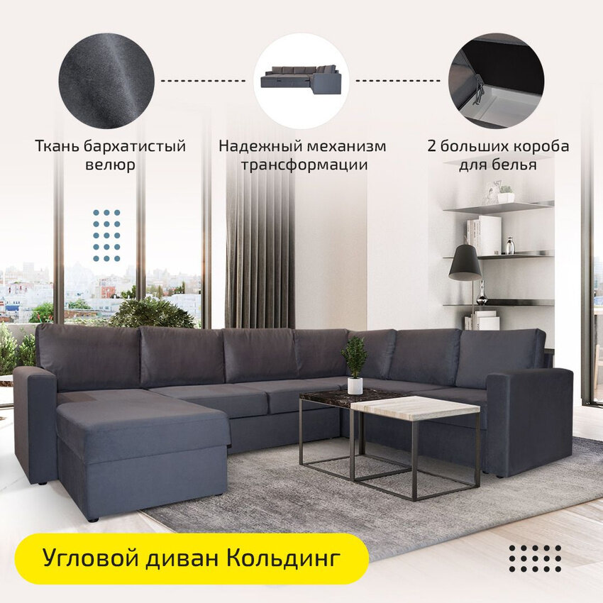 Купить Диван угловой раскладной П-образный Кольдинг, 304х235х85, механизм дельфин, темно-серый велюр