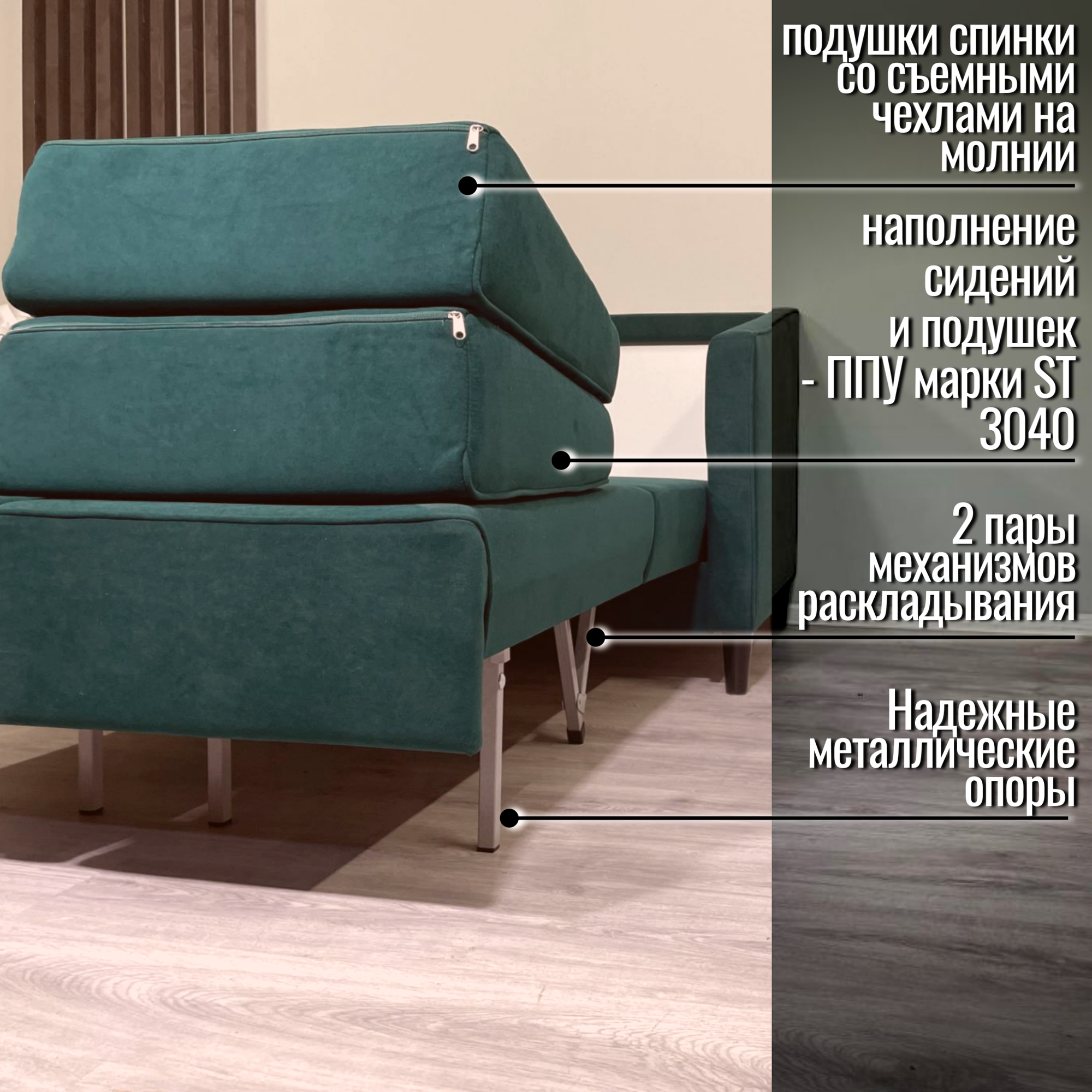 | Особенности | антивандальная обивка, пружинный блок, раскладная конструкция, с подлокотниками, съемные подушки, съемный чехол, ящик для белья |