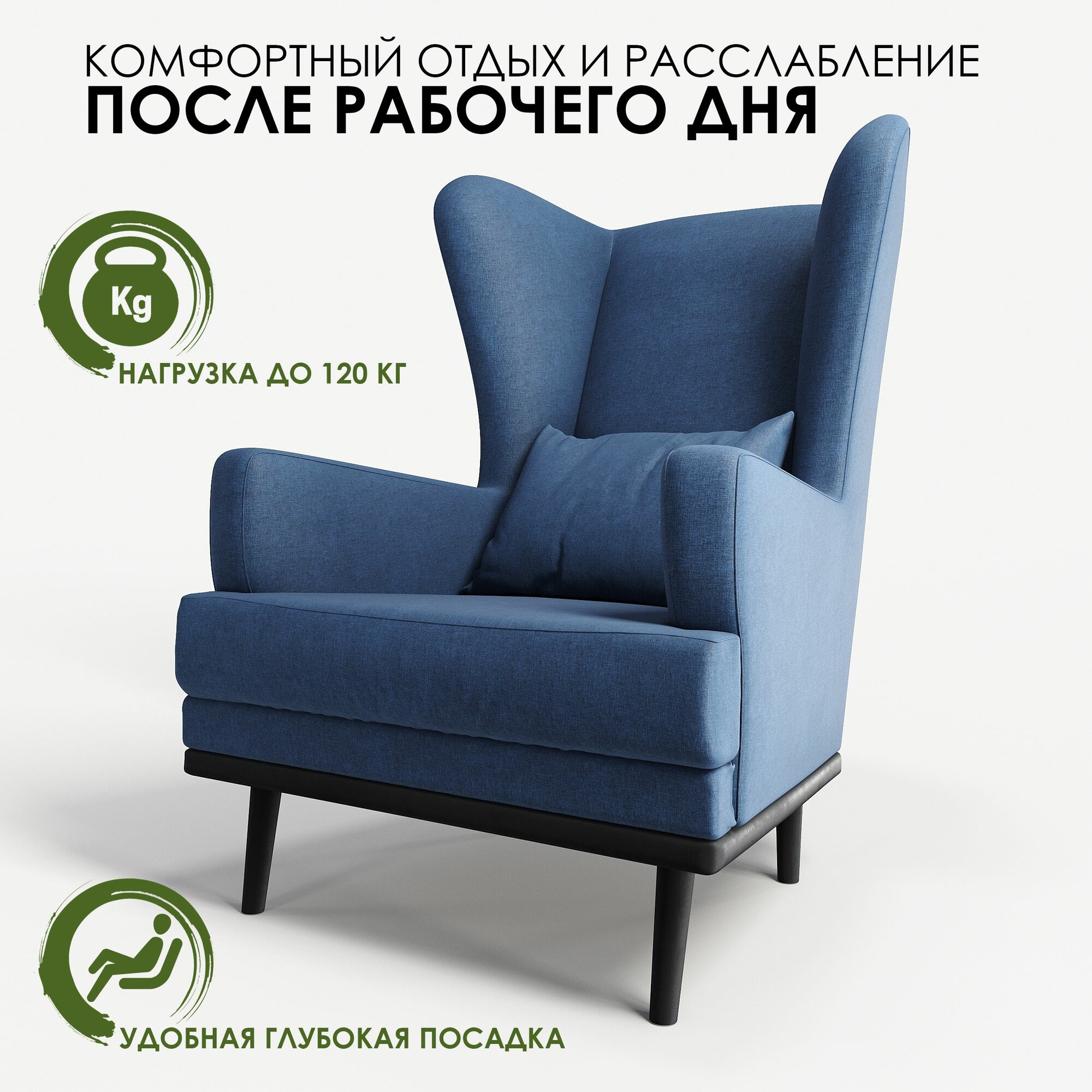 Купить Кресло мягкое с ушами Фантазёр D-11 (синий) на высоких ножках, для отдыха и чтения книг, в гостиную, балкон, спальню и переговорную комнату.