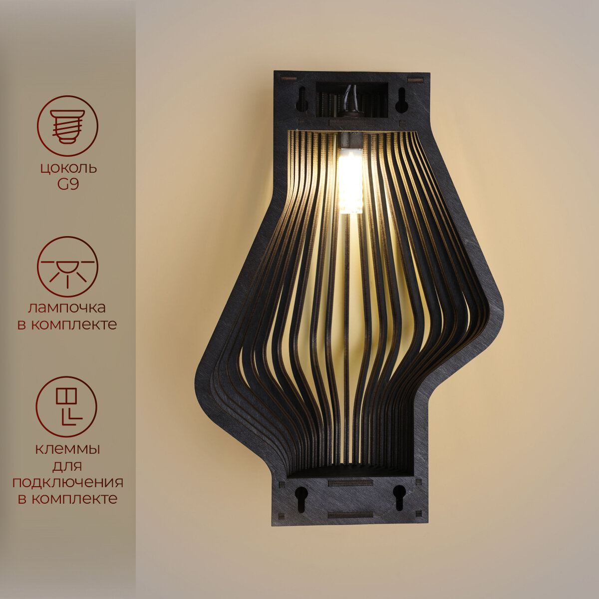 | Комплектация | Деревянный светильник; патрон G9; крепеж; клеммы; упаковка; гарантийная карточка |