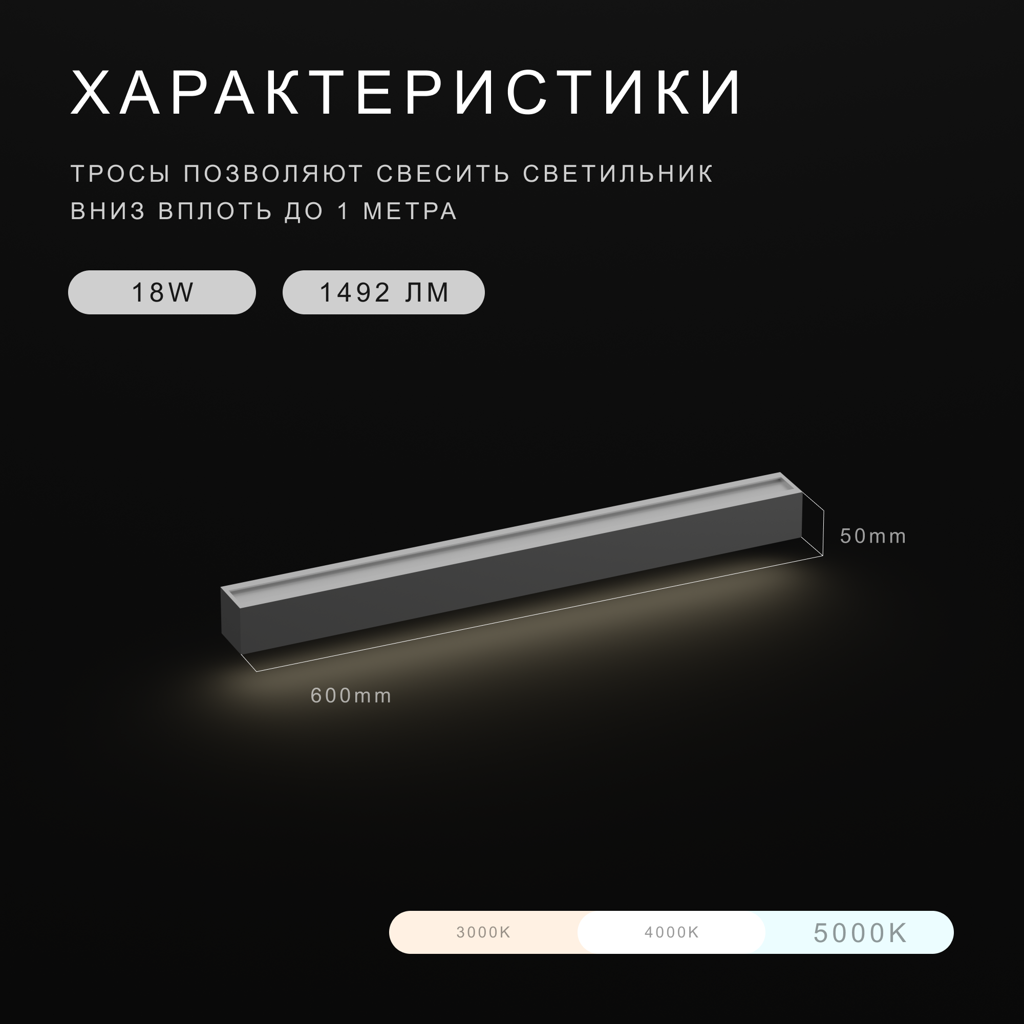 Подвесной светильник "Светолиния", 60х5х5 см, 4000K, 18W, люстра светодиодная, лампа белая