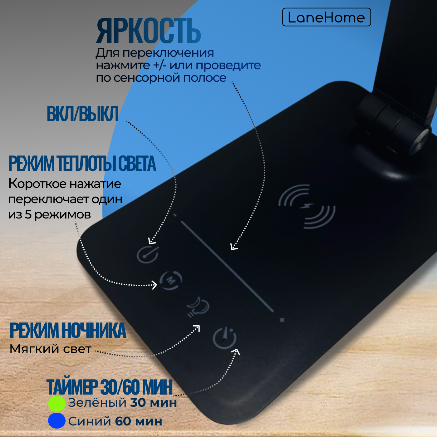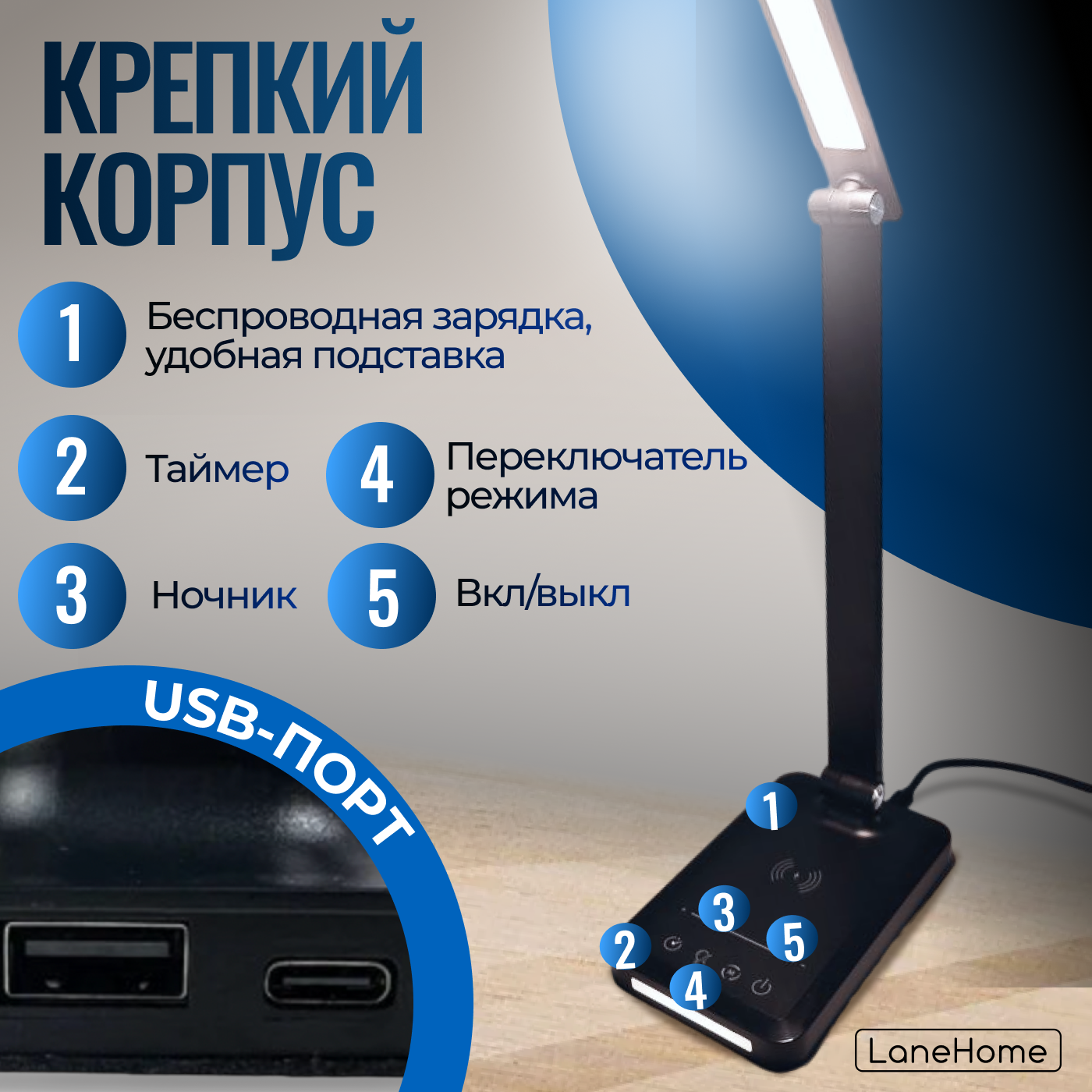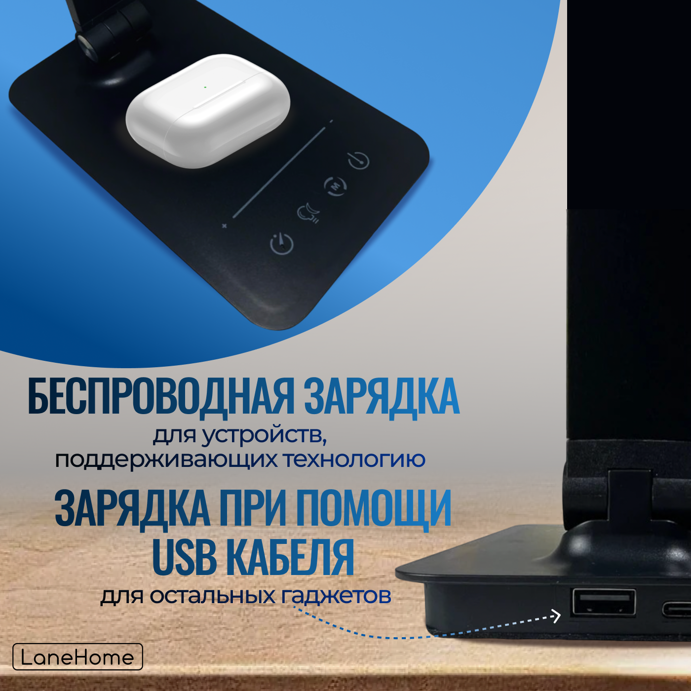 | Особенности | регулировка яркости / с беспроводной зарядкой / складная конструкция |