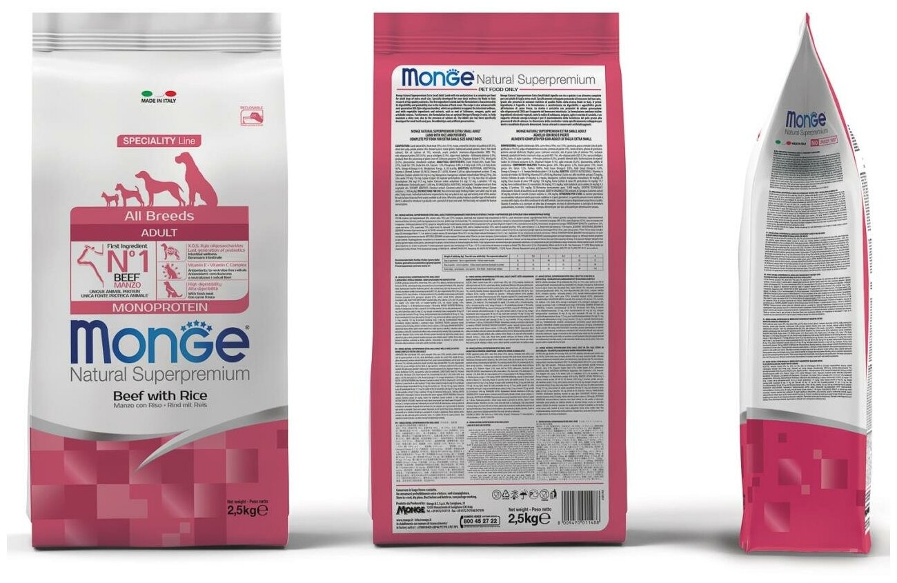 Купить Корм для собак всех пород Monge Dog Monoprotein All Breeds Beef and Rice, говядина с рисом, 2,5 кг