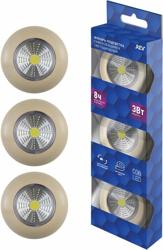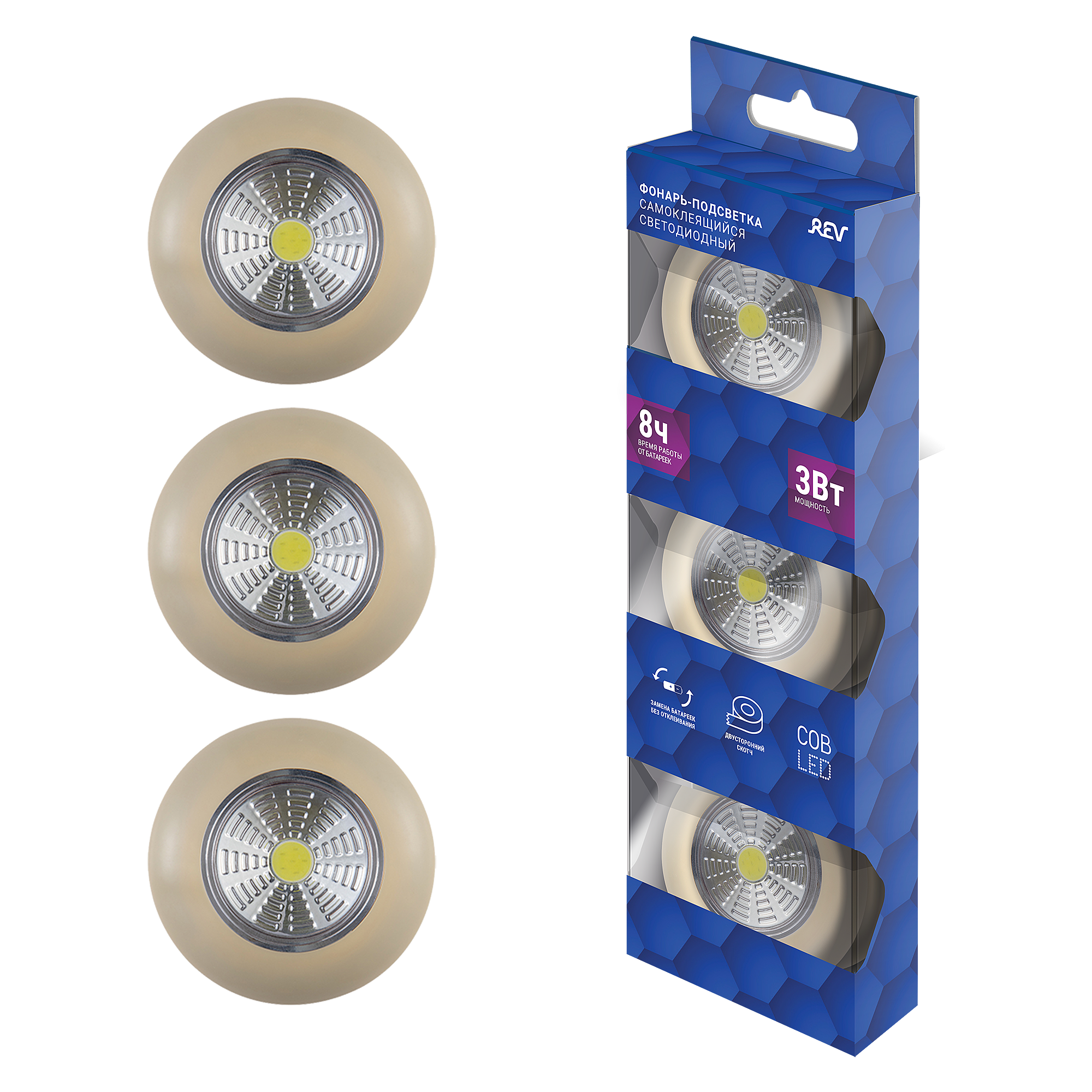 Купить Светодиодный самоклеящийся фонарь-подсветка Pushlight 3Pack слоновая кость, COB 3 Вт, бат. 3xAAA, REV Ritter