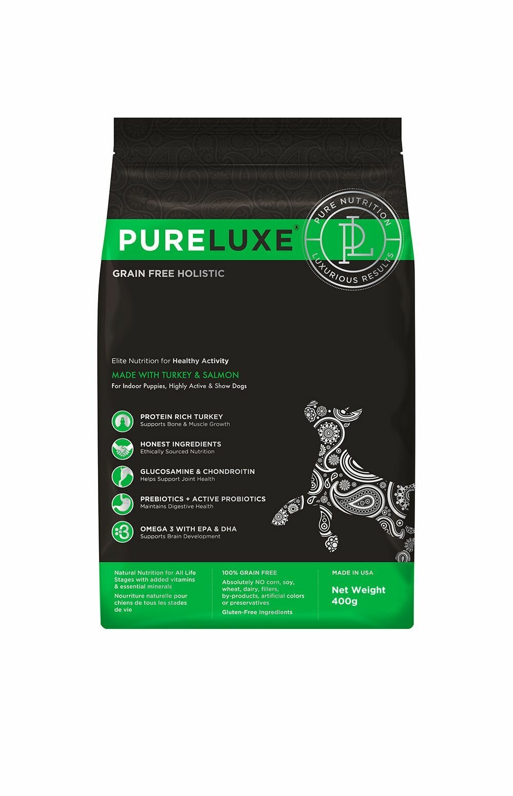 Сухой корм для собак PureLuxe беззерновой, для щенков и активных собак, индейка, лосось 1 уп. х 1 шт. х 400 г
