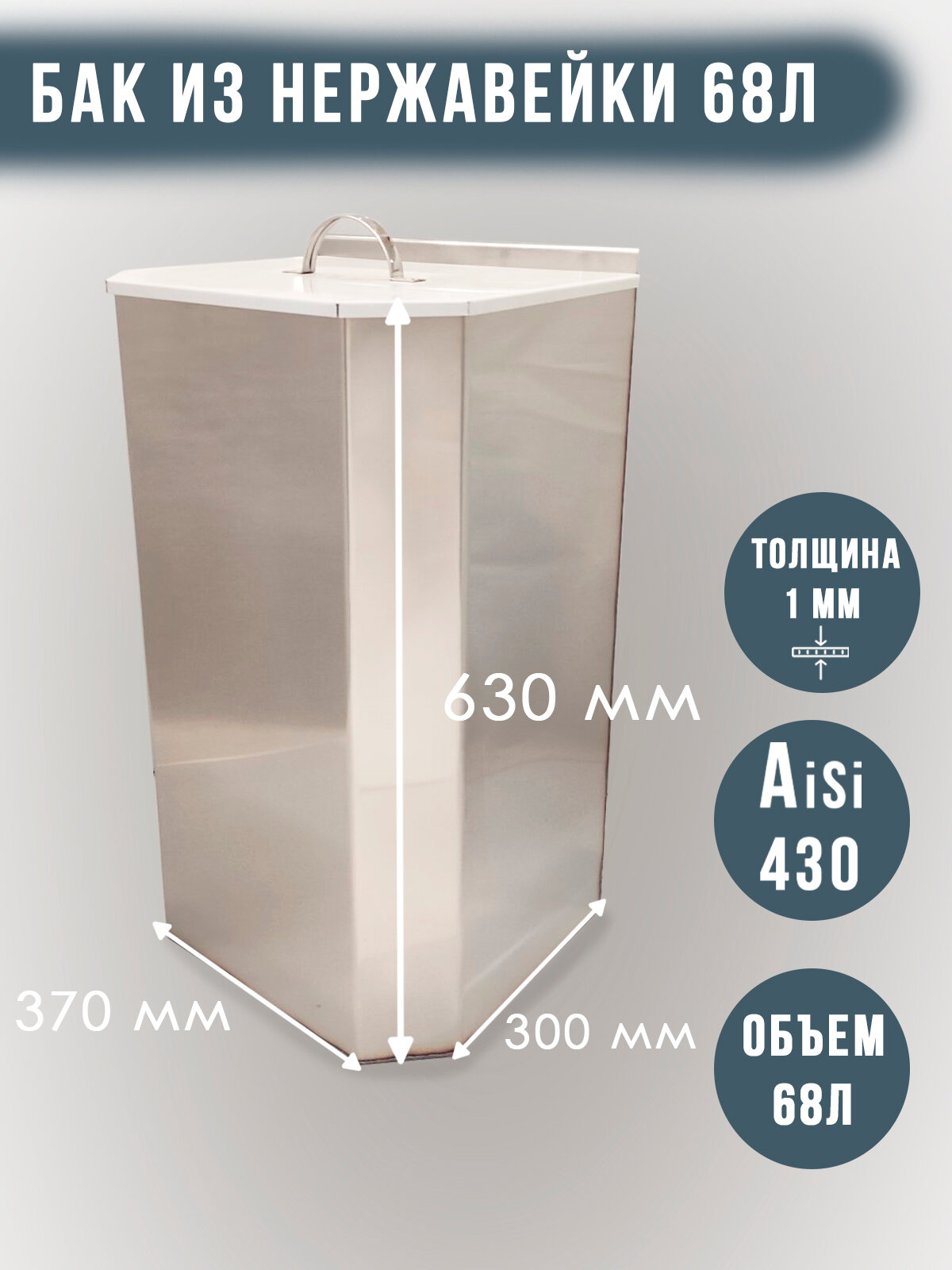 Бак из нержавеющей стали AiSi430 с крышкой, объем 68 литров, без сгона