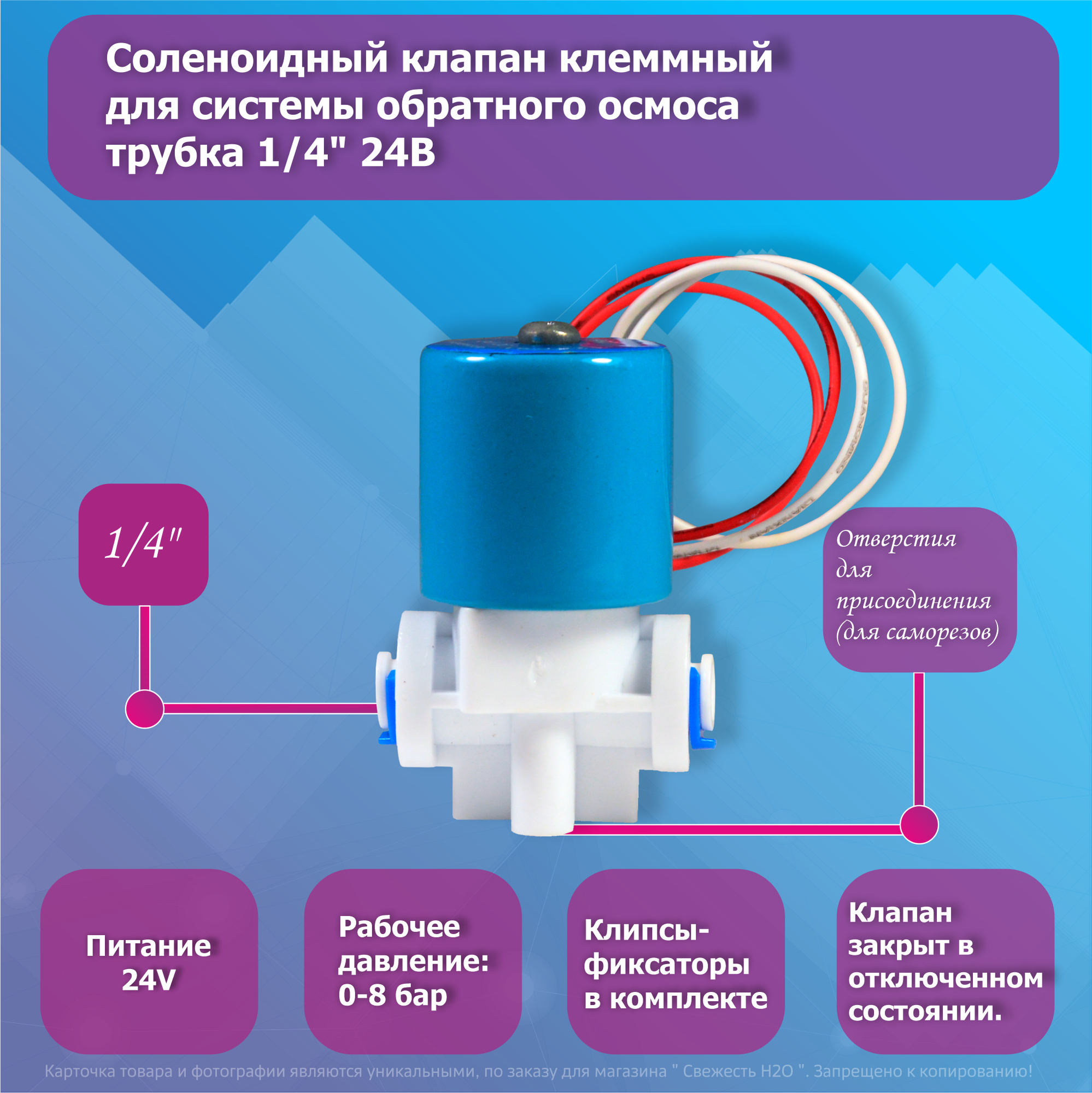 Соленоидный клапан проводной для системы обратного осмоса, трубка 1/4" 24В интересное: