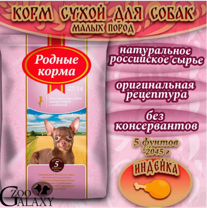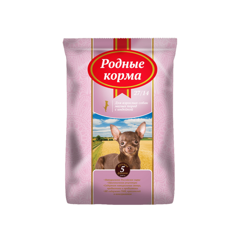 Корм сухой родные корма 27/14 5 русских фунтов для взрослых собак мелких пород, с индейкой 2,045 кг