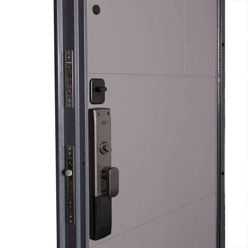СохранитьДверь входная с электронным замком Unicorn в квартиру металлическая Terminal Smart 960х2050, открывание вправо, многослойное наполнение, магнитный уплотнитель, замки высшего класса, черный/серый интересное: