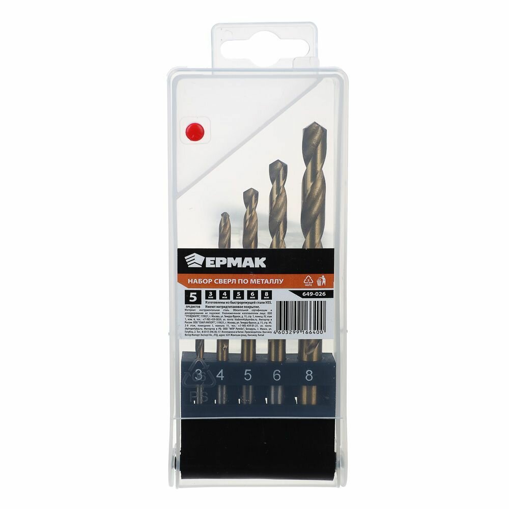 Купить Ермак Набор сверл по металлу 5 пр. П/Б (3-4-5-6-8мм) HSS, нитридтитан.покрытие