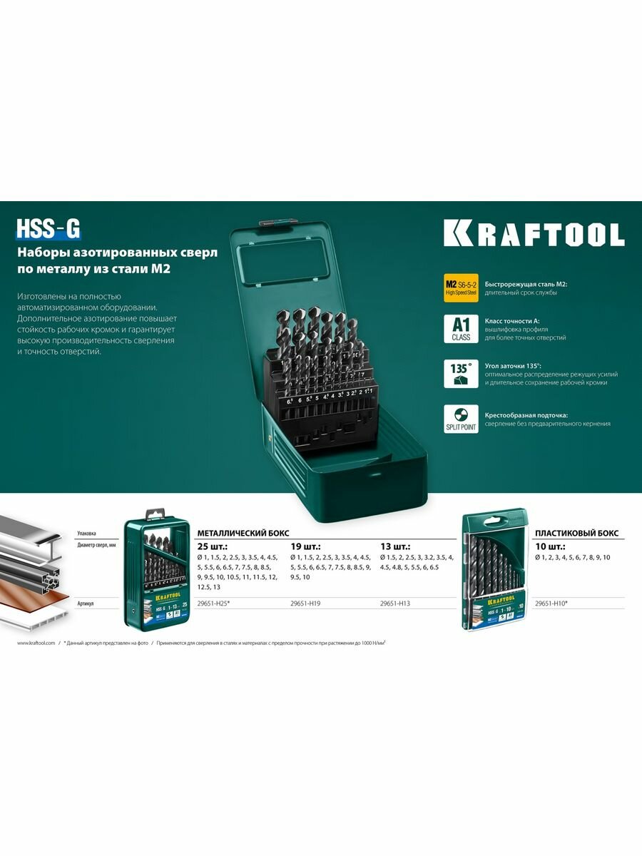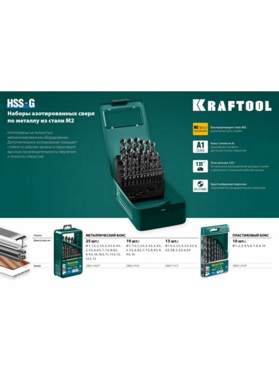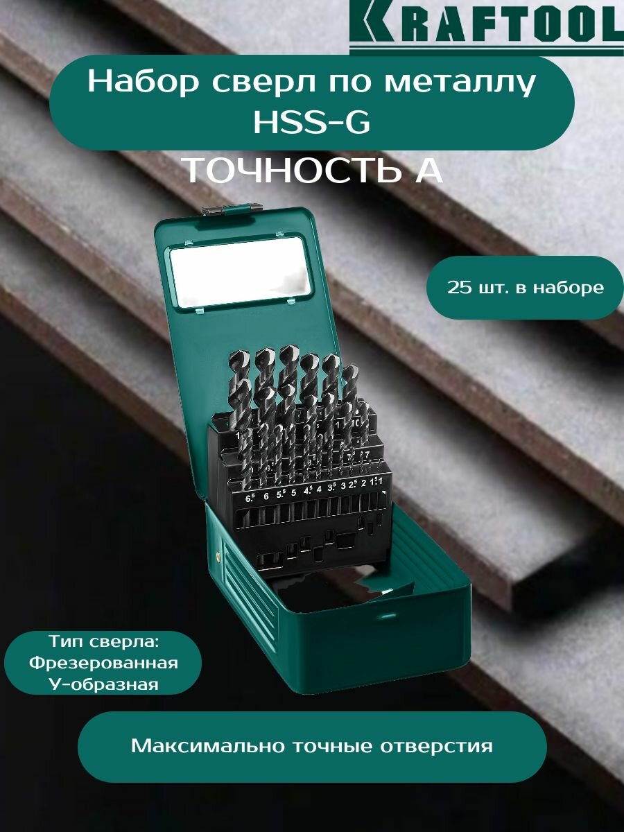 KRAFTOOL HSS-G 25шт(1-13мм), Набор сверл по металлу HSS-G, сталь М2(S6-5-2)