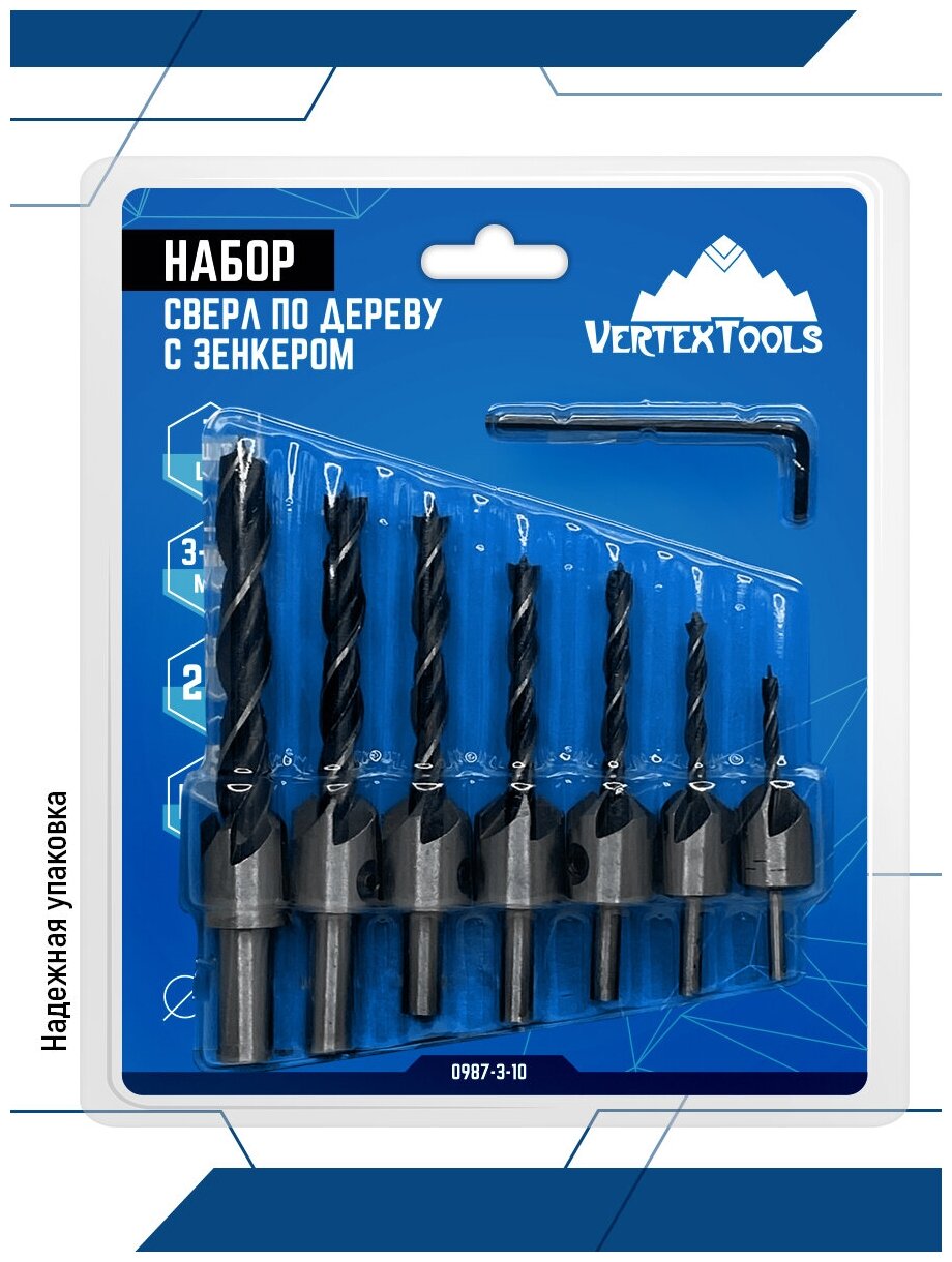 Купить Набор свёрл с зенкером по дереву 7 шт. 3-10 мм VertexTools HSS