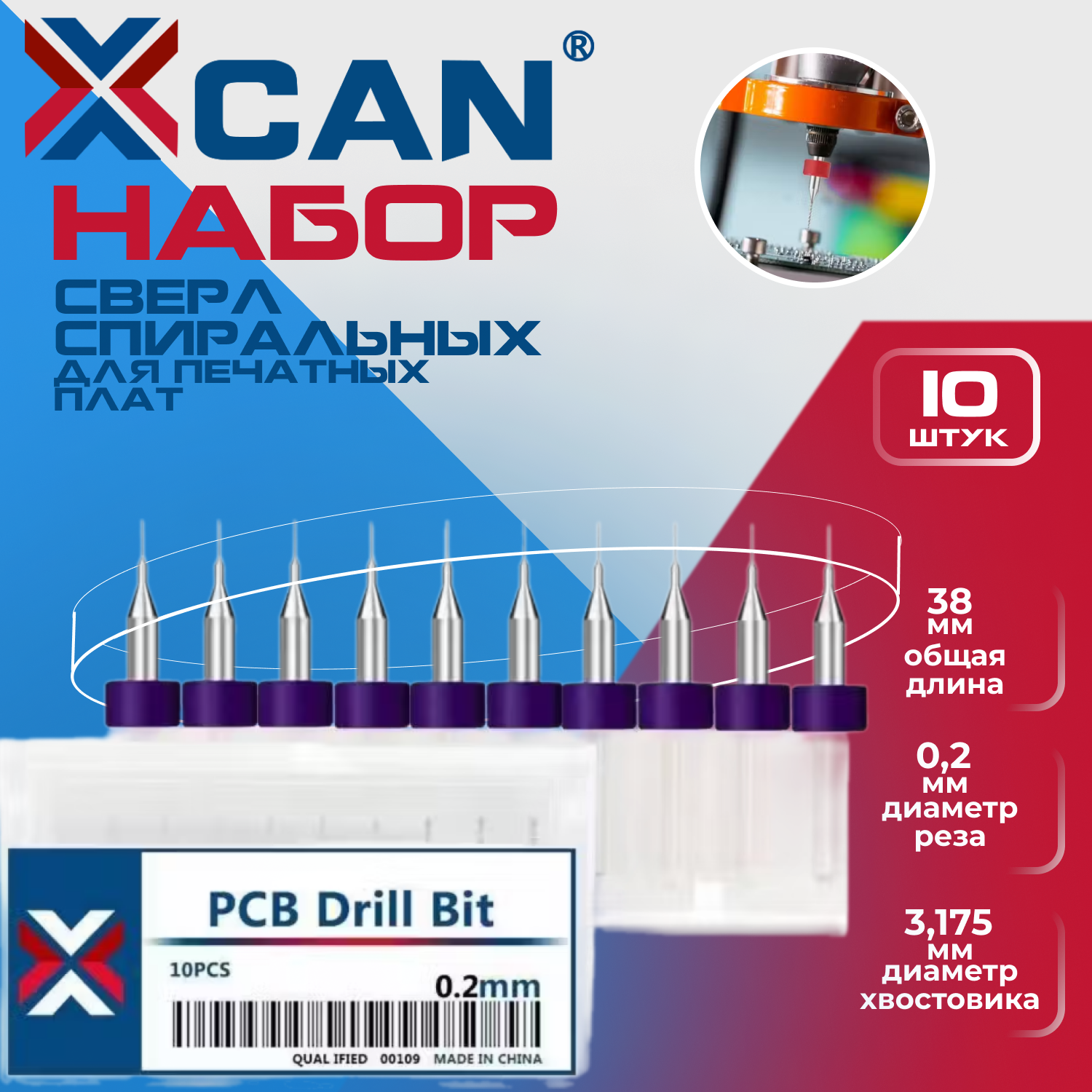 Набор сверл спиральных XCAN для печатных плат, размер 3,175х2,5х38 мм, 10 шт.