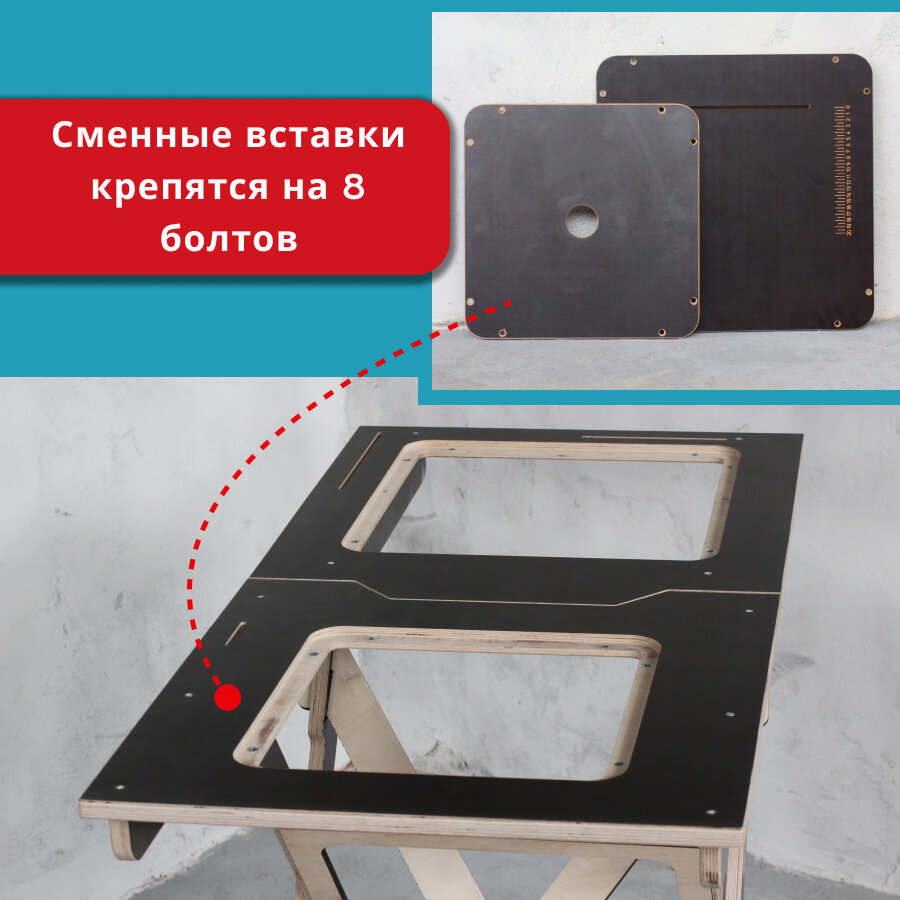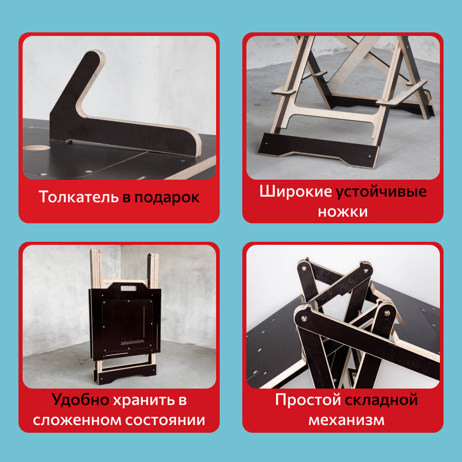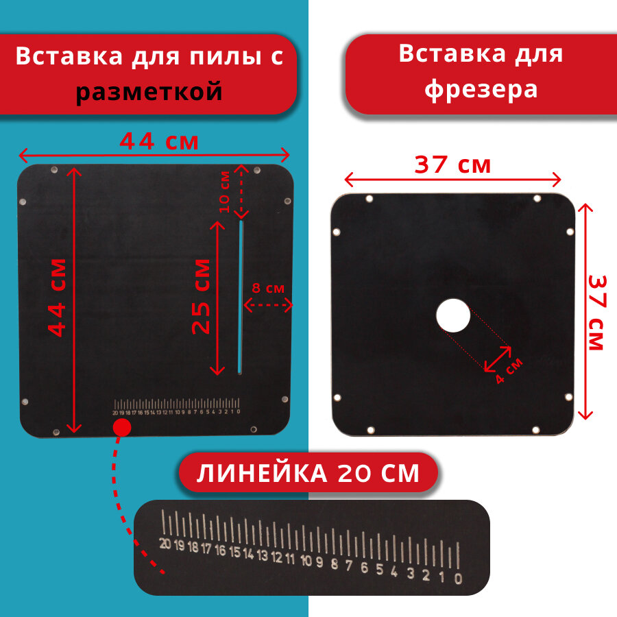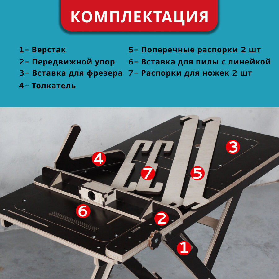 | Подробная комплектация | Рабочий стол; Комплект деталей для фиксации конструкцию ( 4 штуки ); Универсальная пластина для крепления фрезера; Универсальная пластина для установки циркулярной пилы; Передвижной упор; Толкатель толкатель для циркулярной пилы, Упаковка (картонная коробка). |