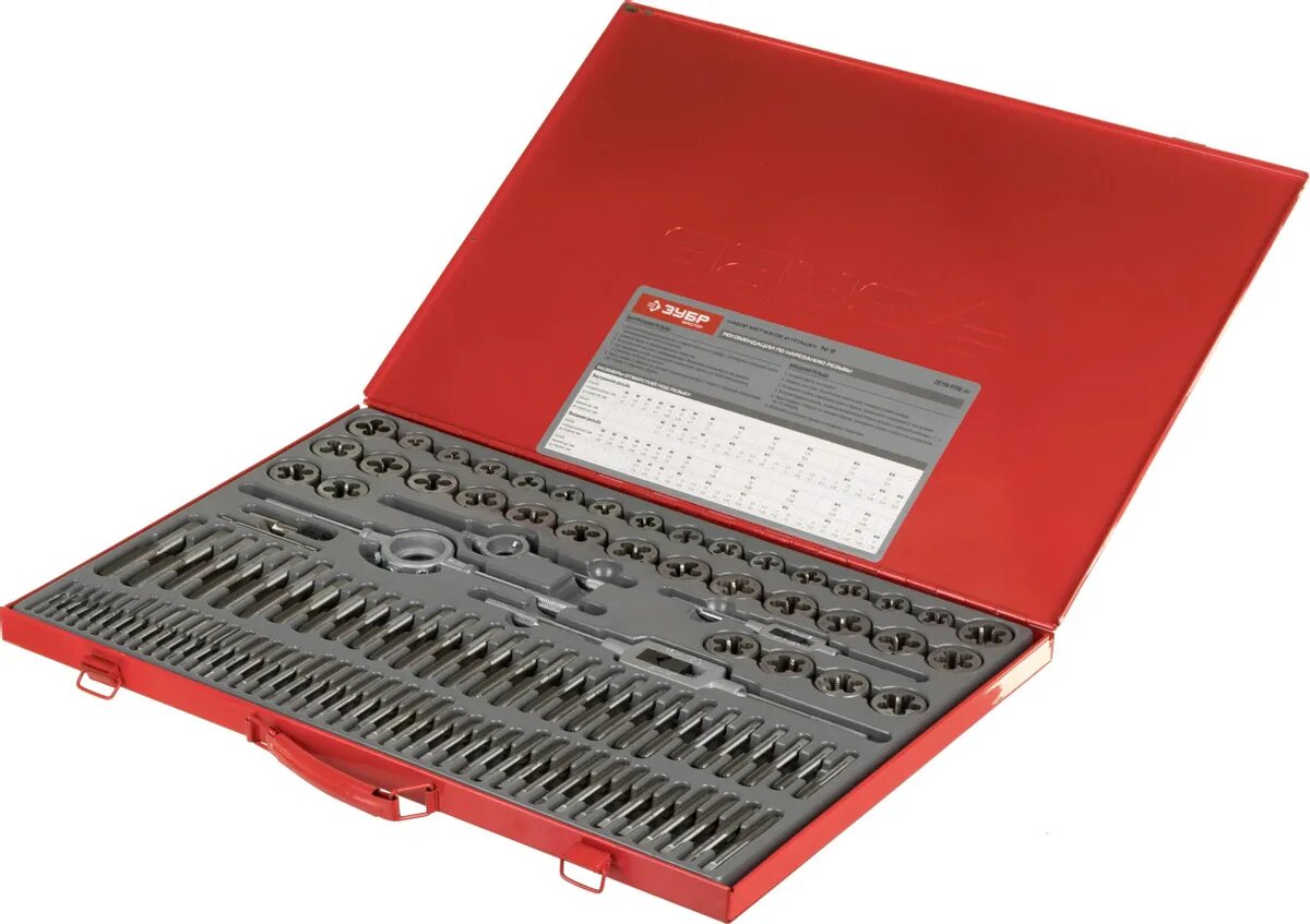 ЗУБР 110 предм., сталь 9ХС, набор метчиков и плашек (28119-H110) интересное: