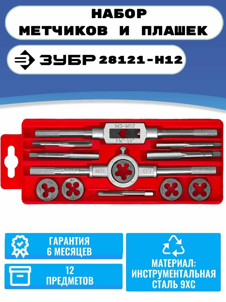 Набор метчиков и плашек М6-М12 Зубр 28121-H12 интересное: