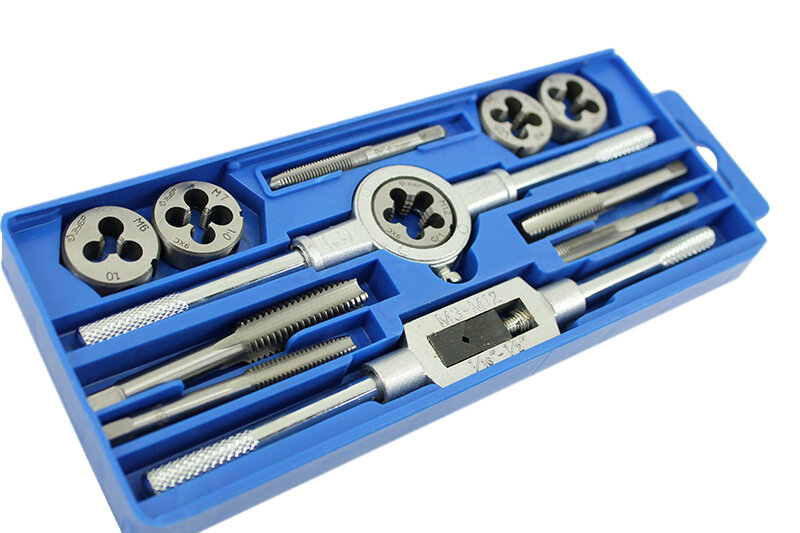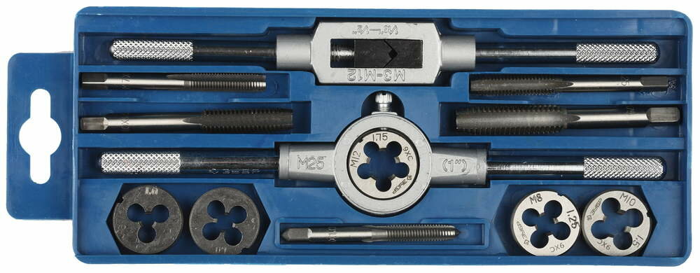 | Подробная комплектация | - 5 метчиков и 5 плашек: M6x1.0, M7x1.0, M8x1.25, M10x1.5, M12x1.75; - метчикодержатель M3-M12; - плашкодержатель Д25 M3-M12; - пластиковый бокс. |