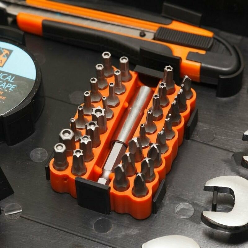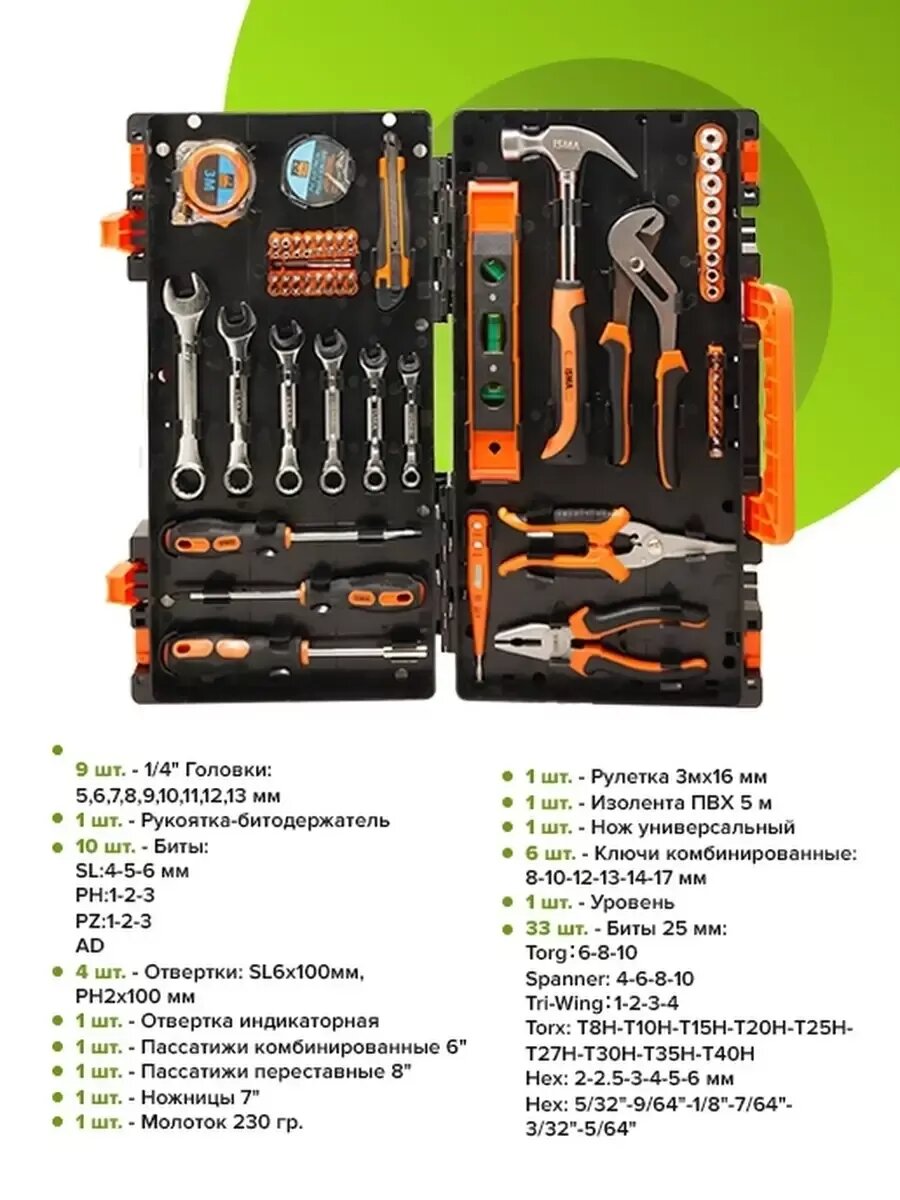 | Инструменты в комплекте | бокорезы / клещи для обжима проводов / клещи для снятия изоляции / ключ разводной / ключи гаечные / ключи имбусовые (шестигранные) / молоток / отвёртки / пассатижи / плоскогубцы / рукоять для бит / трещотка |