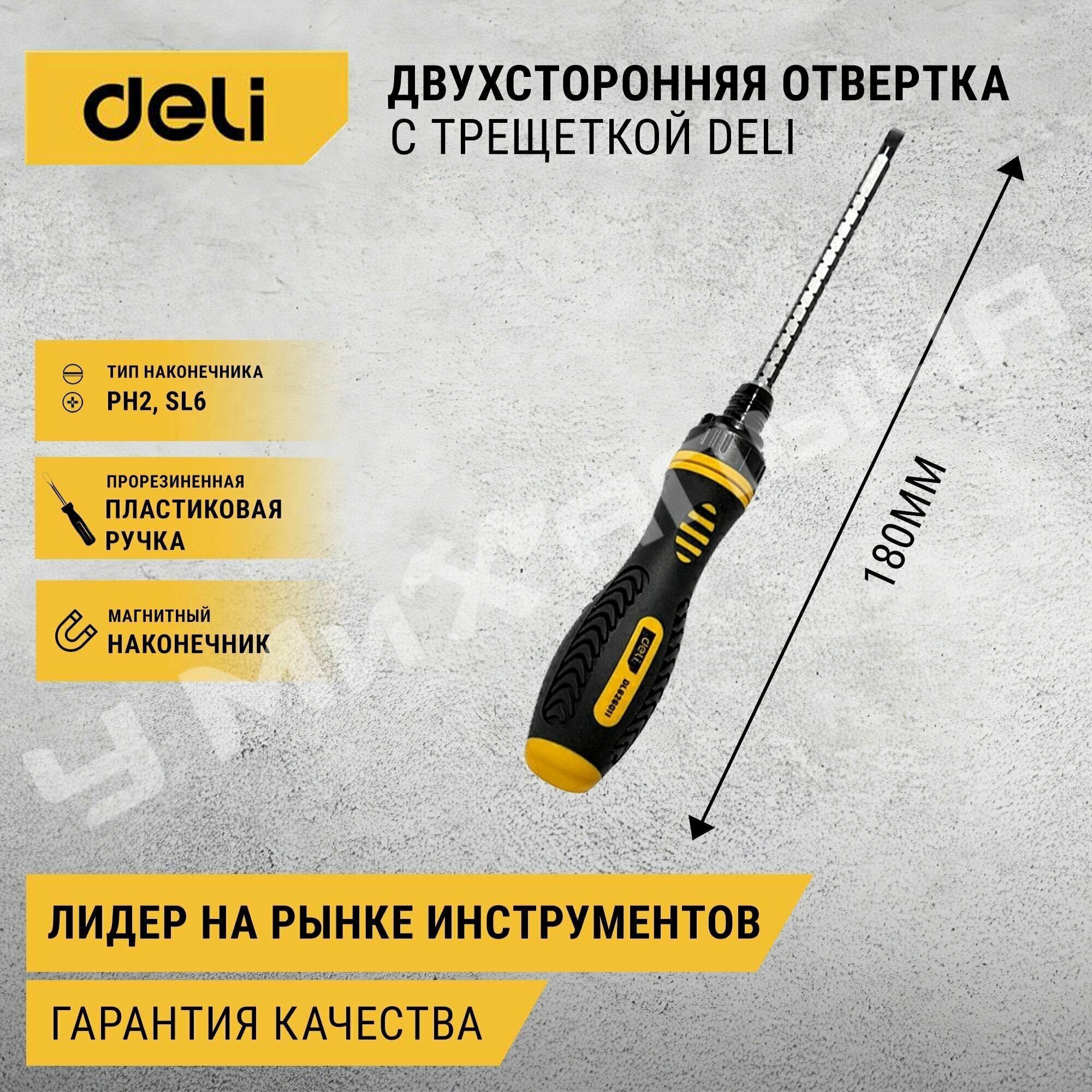 Купить Двухсторонняя отвертка с трещеткой Deli DL626011 PH2+SL6x180мм 6/PH2x180мм. Материал биты: Cr-V. Общая длина: 180-230 мм. Диаметр хвостовика: 6,3 мм.