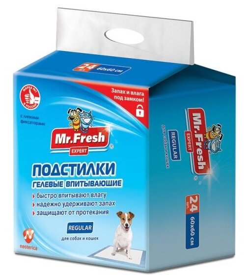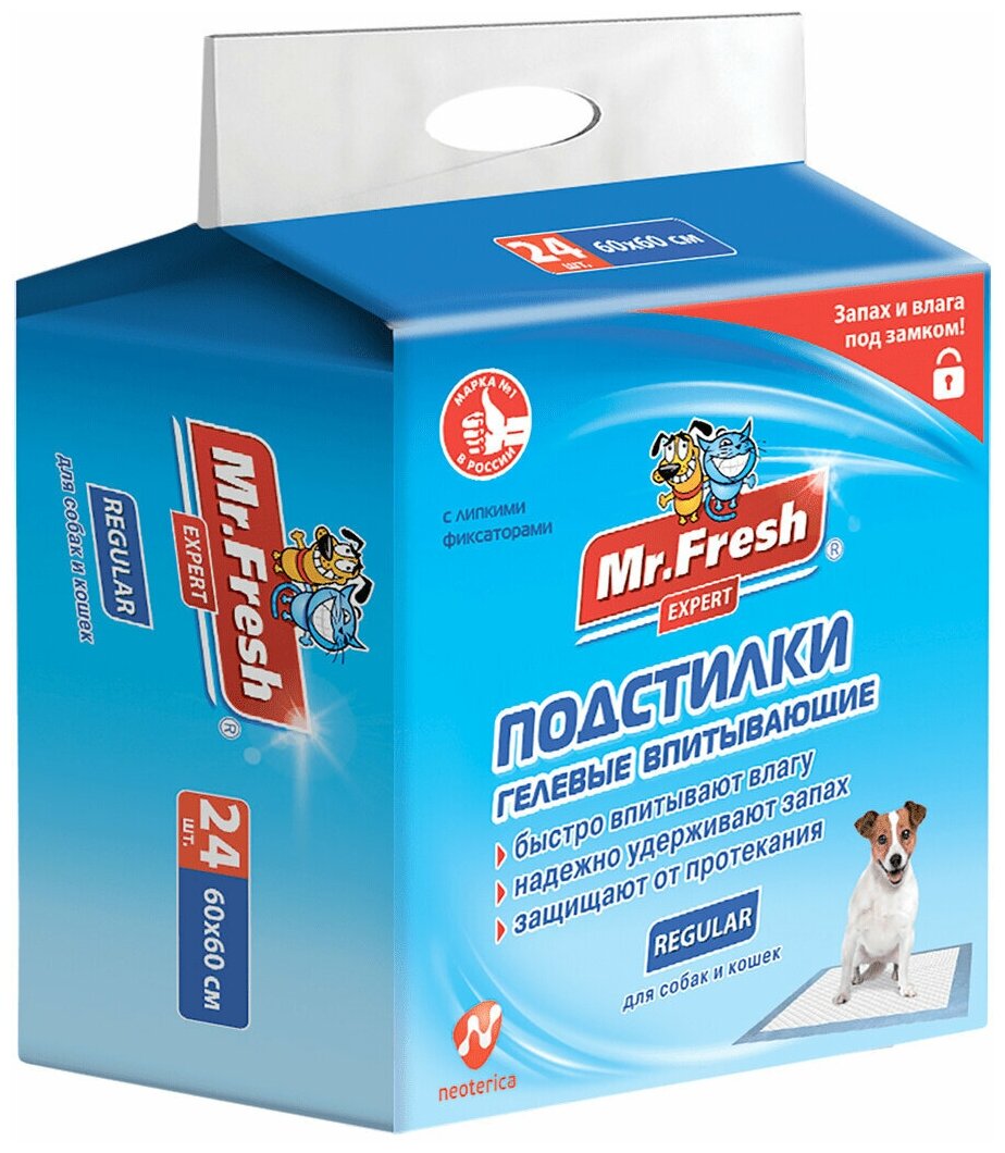 Mr.Fresh Expert Regular Подстилки гелевые впитывающие для собак и кошек 60х60, 24 шт