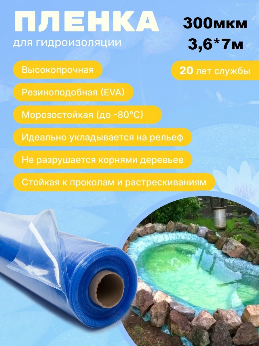 Пленка "Водяной" цвет прозрачно-голубой 300мкм 3,6м*5 м, пленка для водоемов, пленка для бассейна