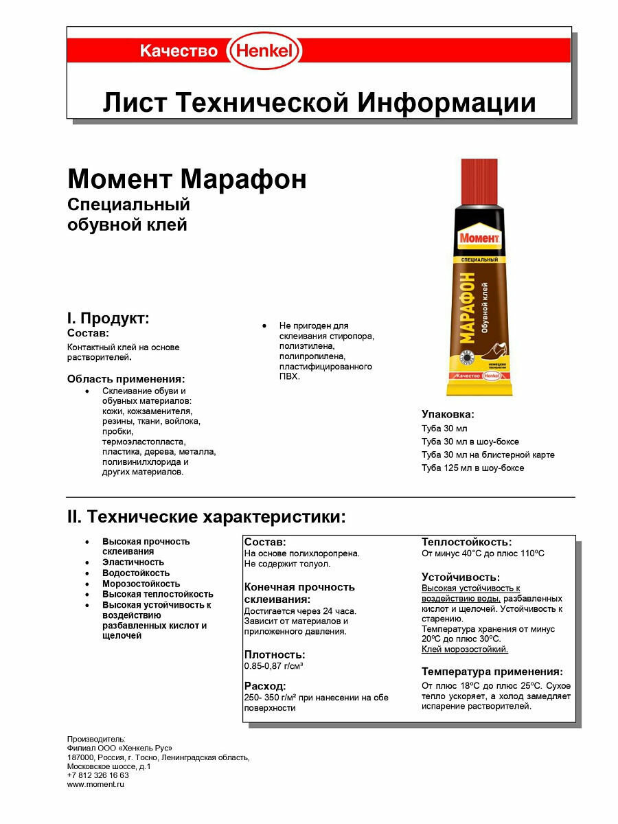 | Дополнительная информация | не содержит толуол; плотность: 0.85-0,87 г/см³; расход: 250- 350 г/м² при нанесении на обе поверхности; склеенным изделием можно пользоваться через 24 часа, конечная прочность склеивания возникает достигается через 72 часа |