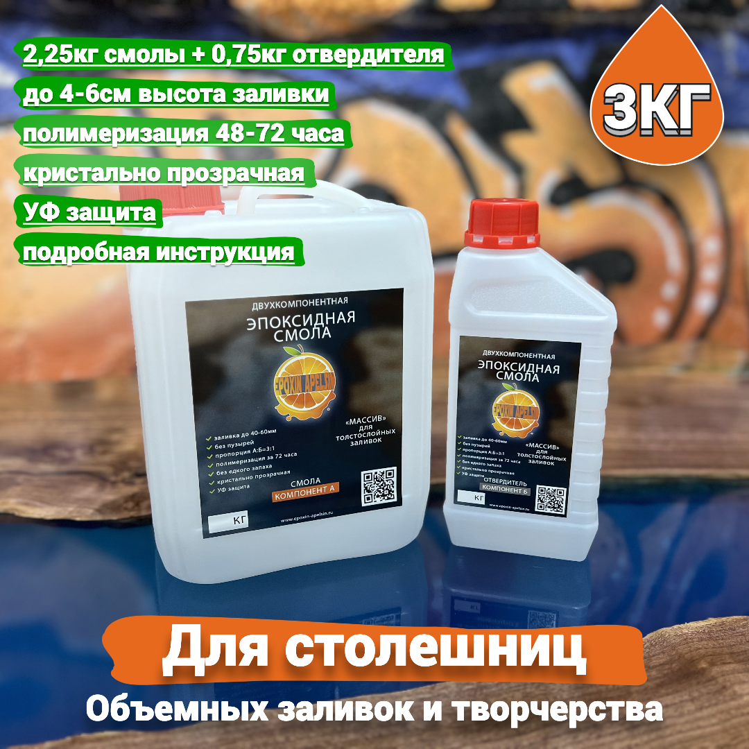 Эпоксидная смола 3кг для столешниц и объемных заливок Epoxin Apelsin Массив интересное: