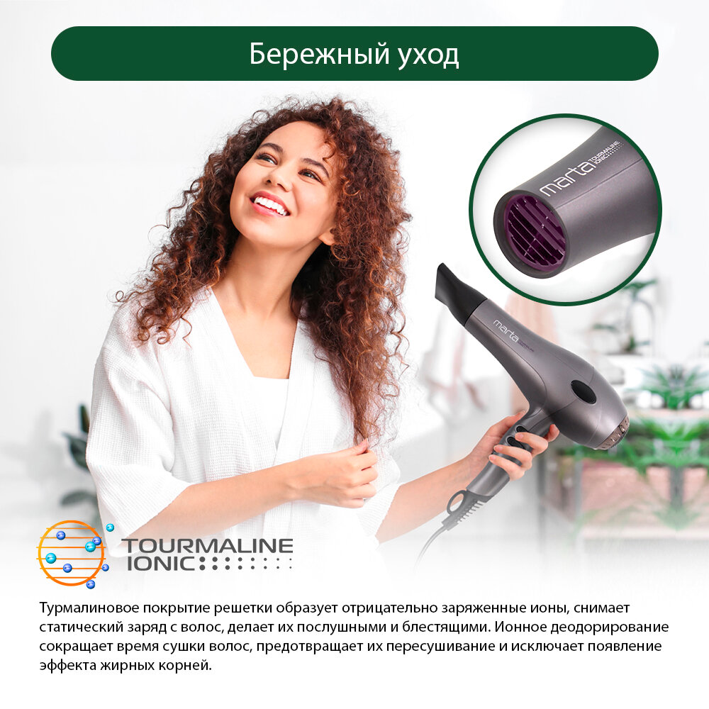Фен для волос Marta / Марта MT-1428 с защитой от перегрева, черный, 3 температурных режима, 2 режима мощности, 1 насадка, 1800Вт шнур 1.6м