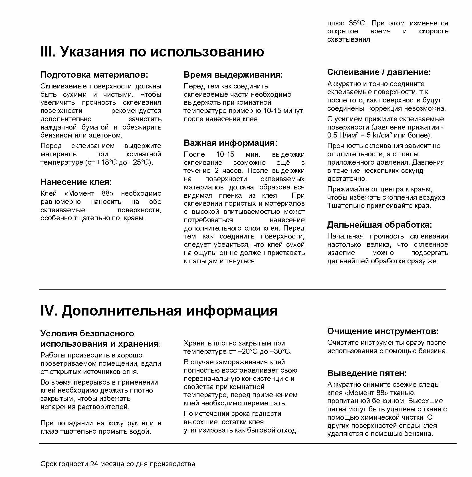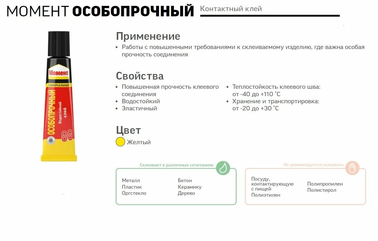 | Дополнительная информация | не пригоден для склеивания стиропора, полиэтилена, полипропилена; не рекомендуется для склеивания посуды, контактирующей с пищей; плотность: 0.86-0,88 г/см³; теплостойкость: от -40°C до 110ºC |